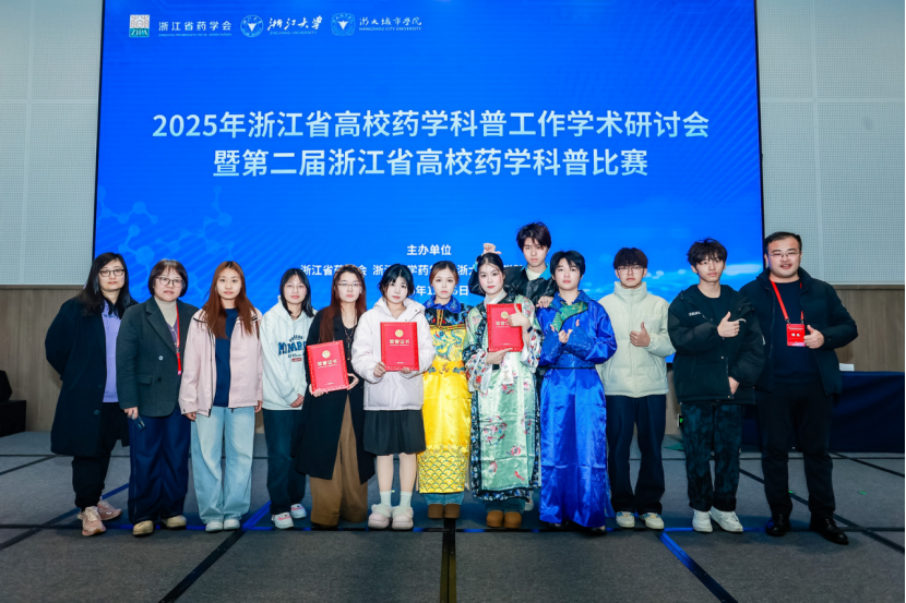12月6日,2025年浙江省高校药学科普工作学术研讨会暨第二届浙江省高校药学科普比赛在浙大城市学院落幕。本届赛事汇聚了来自全省13所高校的21支团队同台竞技。我校医学院学子凭借卓越的科普创新能力和扎实的专业素养,在激烈竞争中脱颖而出,最终荣获一等奖1项、三等奖1项及优胜奖1项。这一成绩不仅是对学生能力的肯定,更是医学院长期探索并践行“以文化人、以德育才”理念,推动文化德育与专业教育深度融合的生动体现。