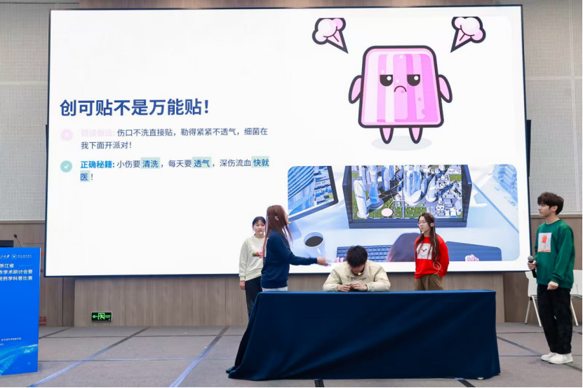 在科普宣讲比赛环节,医学院团队巧妙地将文化创意与科学传播相结合。荣获一等奖的情景剧作品《头孢配酒》,创新性地借鉴经典影视叙事风格,以生动情节和鲜明人物,将严谨的用药安全知识转化为引人入胜的故事。这种融合叙事美育与责任教育的科普形式,让科学知识在文化情境中深入人心,充分彰显了文化德育的感染力与实效性。另一部以拟人化手法阐释合理用药的情景剧《剂动人心》,也凭借其贴近生活、妙趣横生的演绎荣获优胜奖。