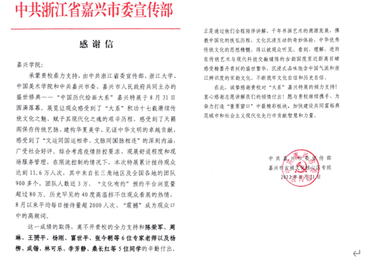 学校组建了由富世平教授、陈荣军副教授、杨刚副教授、马腾飞博士等相关领域专家学者近20人参加的中国历代绘画大系研究团队,集中开展中国历代绘画研究和大展作品鉴赏解读等工作。大展期间,团队成员在特展现场进行专业学术指导,在《读嘉》新媒体平台刊发书画鉴赏文章48篇,在《嘉兴日报·江南周末》刊发书画鉴赏文章8篇;完成“项元汴与明清嘉兴书画文献研究”相关学术论文10余篇;编辑书稿《项元汴研究论集》,组织编写社科普及著作《诗画江南――中国历代书画名作赏析》;参加《盛世修典》中国国家博物馆二十大献礼展的宣传片制作等。