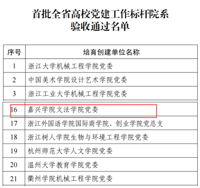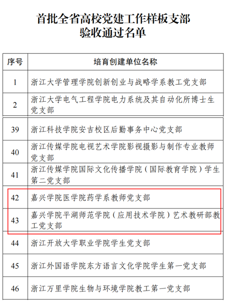 近日,中共浙江省委教育工作委员会办公室公布首批全省高校党建工作示范高校、标杆院系、样板支部培育创建单位验收通过名单,我校文法学院党委通过首批全省高校党建工作标杆院系验收,医学院药学系教师党支部、平湖师范学院(应用技术学院)艺术教研部教工党支部通过首批全省高校党建工作样板支部验收。
