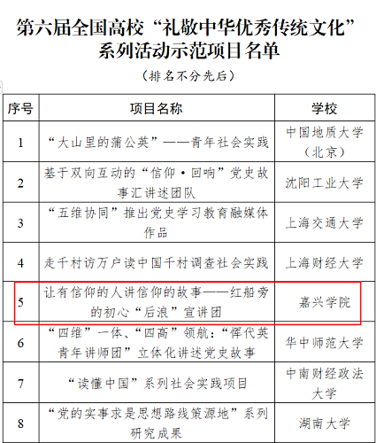 近日,教育部办公厅公布第六届全国高校“礼敬中华优秀传统文化”系列活动示范项目和特色展示项目,嘉兴学院“让有信仰的人讲好信仰的故事——红船旁的初心‘后浪’宣讲团”项目入选示范项目,成为此次活动中浙江省唯一入选的示范项目。