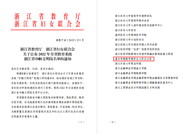 近日,浙江省教育厅、省妇联联合发布《关于公布2022年全省教育系统浙江省巾帼文明岗名单的通知》,确定65个岗位集体为全省教育系统浙江省巾帼文明岗。我校商学院学生工作办公室荣获此称号。