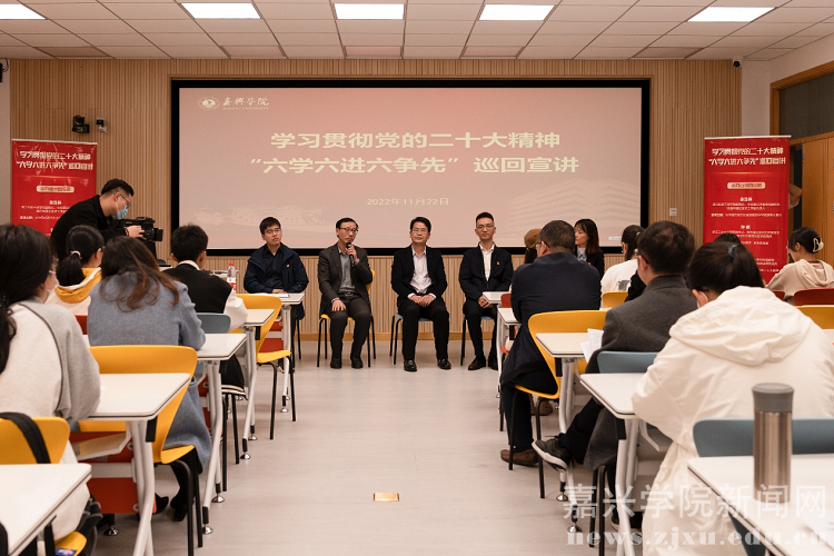 近日来,由32个理论宣讲名师工作室领衔,近百位宣讲名师、青年宣讲员组成的“六学六进六争先”巡回宣讲团,正在全省各地开展党的二十大精神巡回宣讲。当天,巡回宣讲团走进我校,来自浙江红船干部学院、中共嘉兴市委党校、浙江工业大学的4名专家,与我校部分师生代表面对面互动交流,学理论、悟思想、求新知,以深入浅出的语言和深邃的思想内涵,让党的二十大精神真正入脑入心。