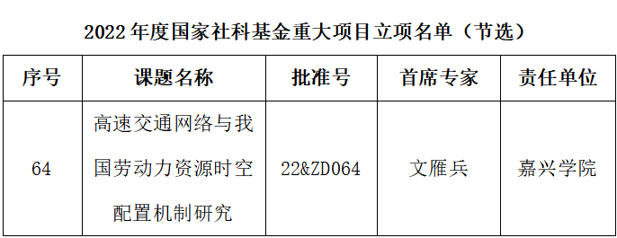 12月8日,全国哲学社会科学工作办公室公布了2022年度国家社科基金重大项目立项名单,我校文雁兵教授作为首席专家申报的“高速交通网络与我国劳动力资源时空配置机制研究”课题成功获批。这是我校继2020年实现国家社科基金重大项目的历史性突破后,获批的又一项国家社科基金重大项目。