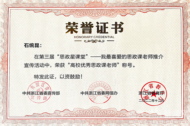 近日,第三届“思政星课堂”——我最喜爱的思政课老师推介宣传活动获奖名单公布。我校教师石统昆获评浙江省“高校优秀思政课老师”。