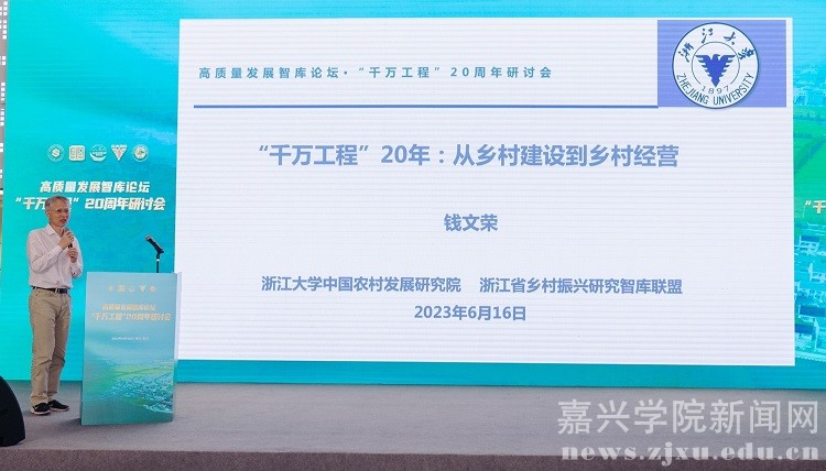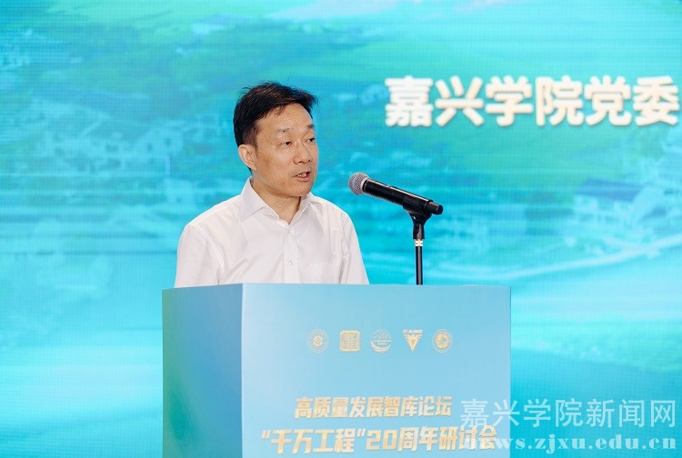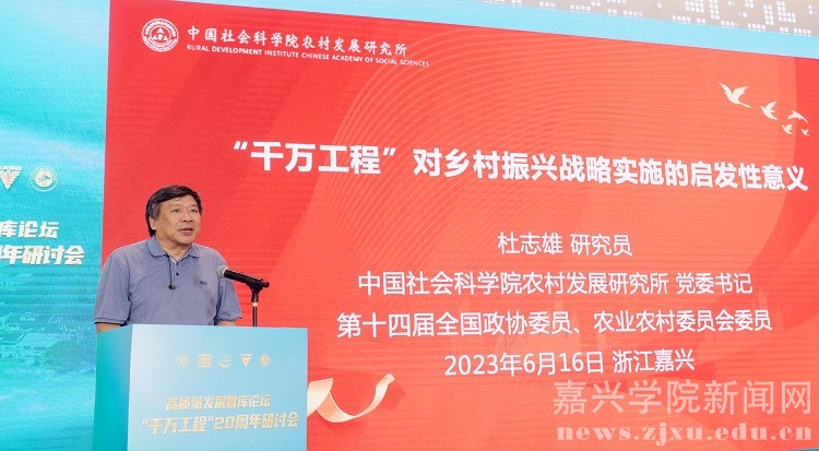 6月16日,由浙江省社会科学界联合会、浙江省乡村振兴研究智库联盟联合主办,浙江大学中国农村发展研究院和我校中国共同富裕研究院共同承办的高质量发展智库论坛·“千万工程”20周年研讨会在嘉兴举行。全国政协委员、中国社会科学院农村发展研究所党委书记、副所长杜志雄,农业农村部管理干部学院副院长朱守银,浙江省社会科学界联合会党组成员、秘书长刘东,浙江省农业和农村工作领导小组办公室原副主任顾益康、原副巡视员李建新,浙江大学中国农村发展研究院院长、浙江省乡村振兴研究智库联盟负责人钱文荣,嘉兴学院党委书记、嘉兴学院中国共同富裕研究院院长卢新波出席会议。副校长周宏伟主持开幕式。