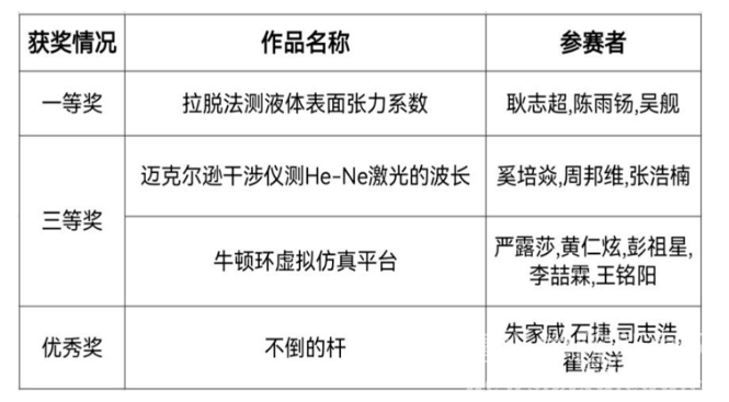 近日,第九届全国大学生物理实验竞赛(创新)结果公布,我校学生团队获得讲课类一等奖1项、三等奖1项,自选类三等奖1项,命题类优秀奖1项。