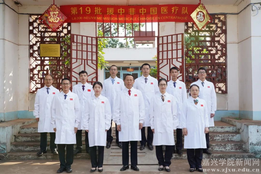 第19批援中非中国医疗队先后共12名队员,除1名翻译外,其余11名队员均由嘉兴地区整建制选派。学校附属医院神经内科王宝祥主任医师、外科徐言副主任医师、放射科王佳主任医师,以及餐饮部朱燠彬/蔡辉(先后派遣)作为第19批援中非中国医疗队队员,于2022年6月11日远赴万里之外的中非共和国执行医疗援外任务。2023年12月28日,他们顺利完成18个月的国家援外医疗任务,载誉凯旋。