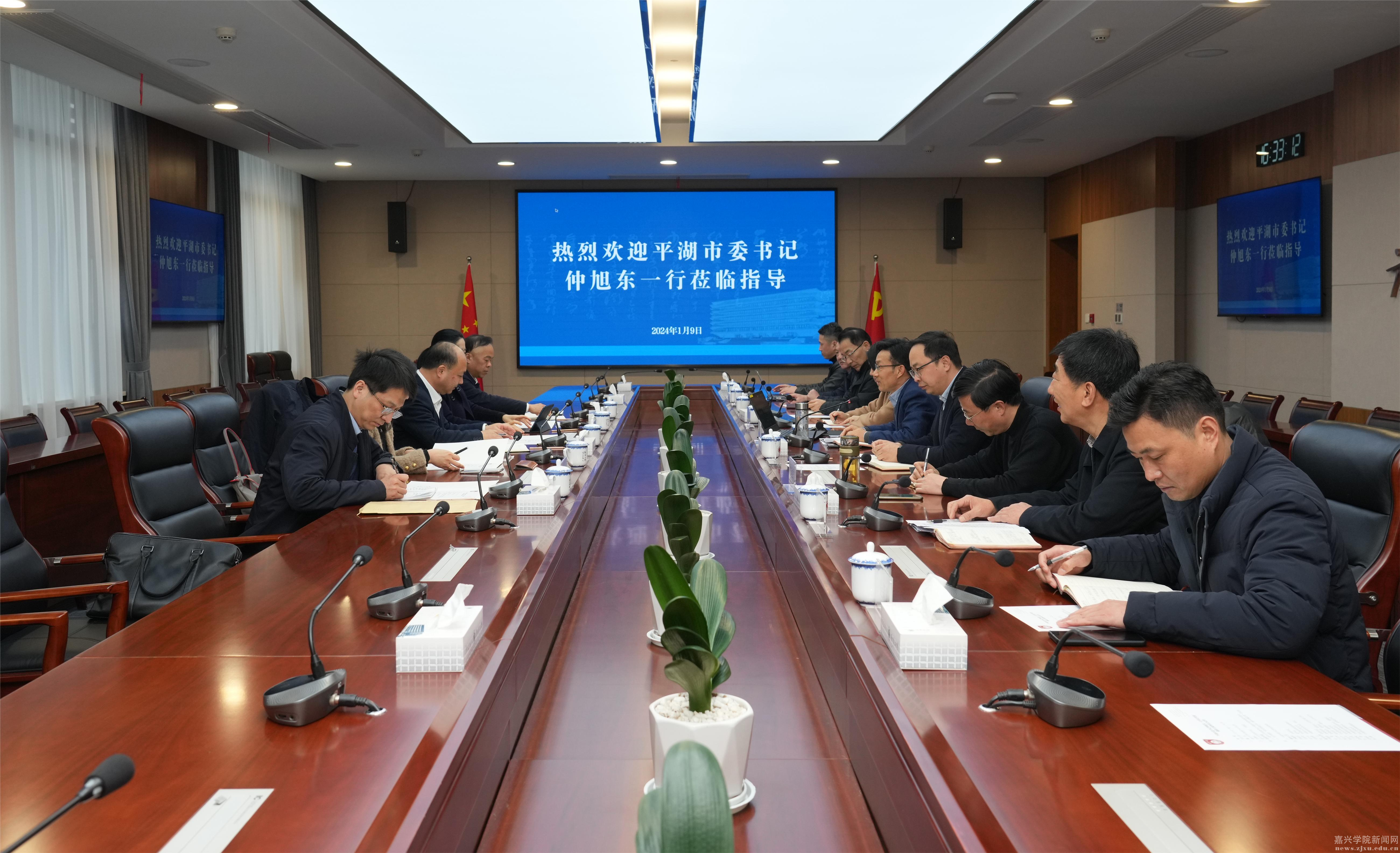 1月9日,平湖市委书记仲旭东、副市长宋怡玲一行来校调研交流。校党委书记卢新波,党委委员、副校长王立玮出席座谈会。