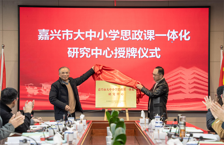 会上,举行了嘉兴市大中小学思政课一体化研究中心授牌仪式。钱方明和金剑辉为研究中心揭牌。
