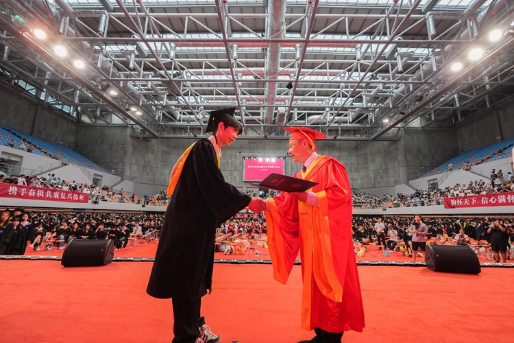 校长陆军院士为获得荣誉学士学位的2024届毕业生代表授予学位证书和荣誉学士学位证书、拨穗。