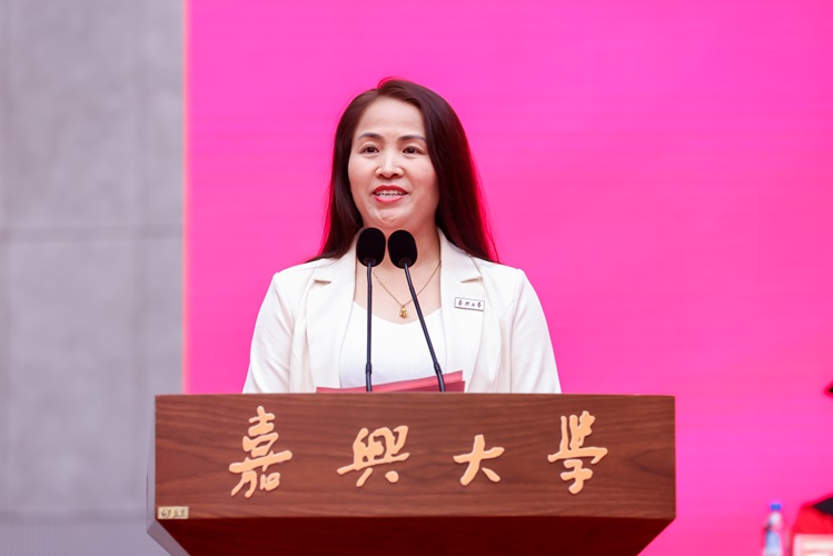 材料与纺织工程学院高材201班学生景羽洁家长、青海德令哈市八一路幼儿园教学园长杨红梅女士作为家长代表发言,她代表全体毕业生家长感谢嘉兴大学为广大学子提供了广阔的平台和丰富的资源,感谢嘉大老师给予了广大学子无微不至的关怀和指导,并勉励毕业生永远心怀感恩、持续勤奋学习、坚持不懈奋斗,为社会做出更大的贡献,为母校争光。