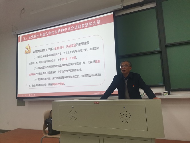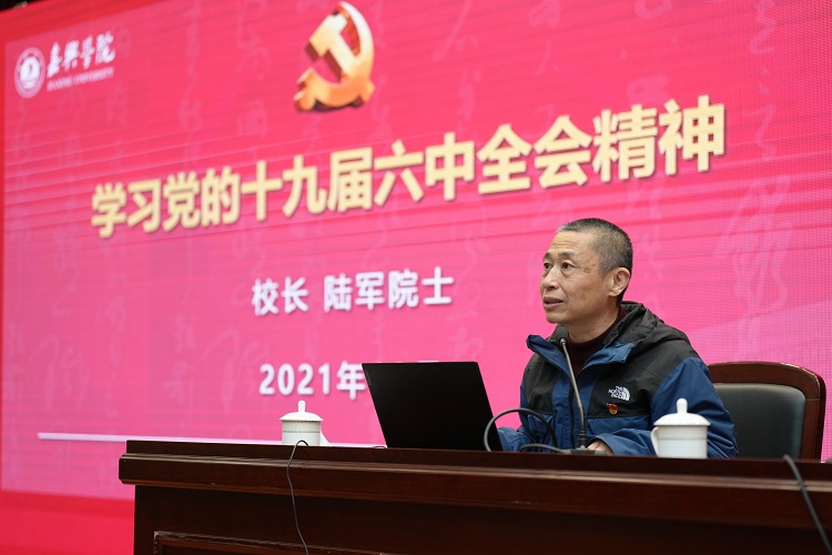 中国工程院院士、校长陆军全面解读了党的十九届六中全会的政治意义、历史意义和战略意义,深刻阐述了全会“一个主题”“两个确立”“三次历史性飞跃”“四个伟大成就”“五个方面历史意义”和“十个坚持”的丰富内涵。他表示,党的十九届六中全会是在我们党成立100周年之际,党领导人民实现第一个百年奋斗目标、向着实现第二个百年奋斗目标迈进的重大历史关头,召开的一次总结过去、展望未来的历史性、战略性重要会议。他强调,学习宣传贯彻党的十九届六中全会精神,要与学校实际结合起来,从中汲取推动学校高质量发展的智慧和力量。一要强化育引并举,打造一流高效的师资队伍。坚持师德为先,优化师资队伍结构,提升教师教学科研能力,强化人才育引对优势特色学科、专业发展的支撑,增强师资队伍创造力,切实发挥人才资源的高效能、高效益。二要强化平台建设,加强理论研究阐释和科技创新。充分发挥人文智库平台作用,组织开展全会精神研究阐释,争取再推出一批高端研究成果。坚持院士领衔、团队作战,打响卡脖子技术攻坚战,打造科学研究、技术创新与成果转化的“策源地”,助力嘉兴成为长三角核心区先进制造业基地和“互联网+”产业高地。三要强化应用型建设,提升服务嘉兴贡献度。不断加强与政府和企业的科技合作、技术咨询服务等,助力嘉兴打造人才生态最优市;奋力打造应用型复合型专门人才“供给地”,争当产教融合发展“典范生”;聚力嘉兴“三富四优、七个典范”等建设目标,助力嘉兴建设新时代文化文明高地,打造国际化活力新城,以更大决心、更实举措为嘉兴建设共同富裕示范区典范城市作出新的更大贡献。