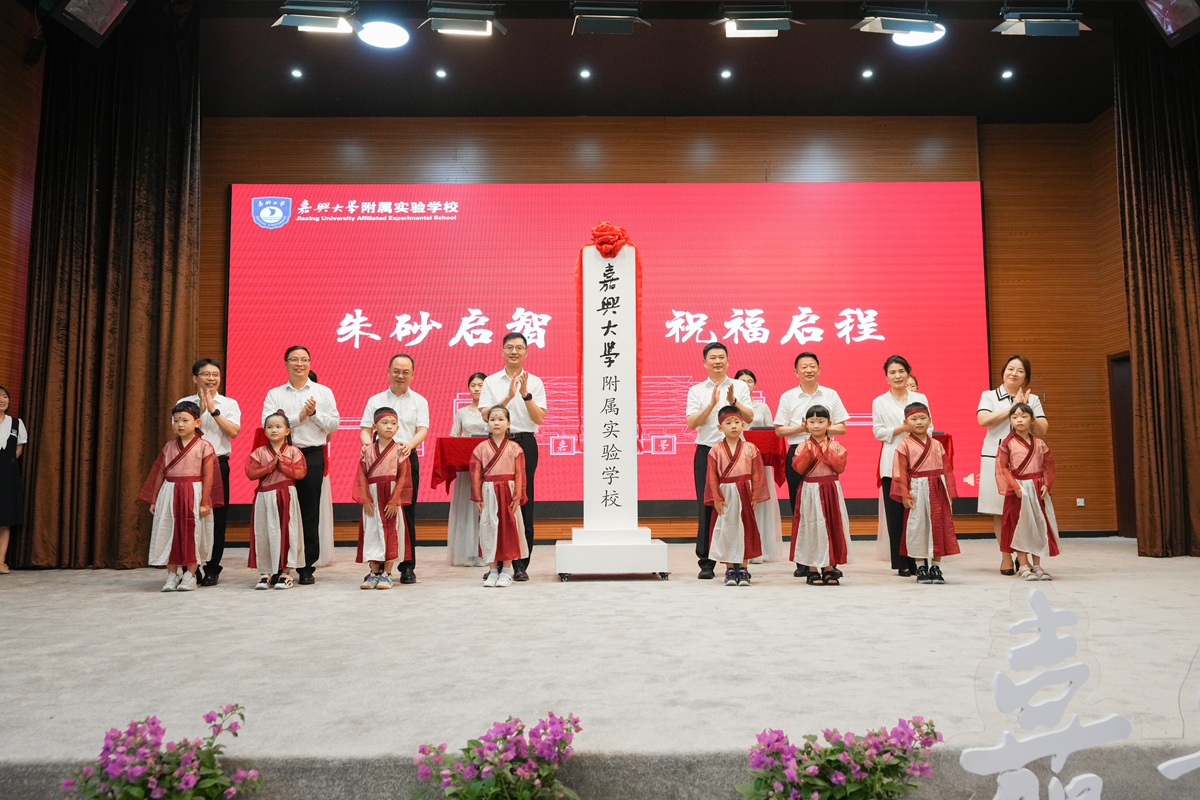 9月2日上午,嘉兴大学附属实验学校正式揭牌。嘉兴市委常委、副市长齐力,我校党委书记沈希,我校党委委员、副校长王立玮,嘉兴市教育局党委副书记金剑辉,嘉兴教育学院院长朱军一,嘉兴市经开区民生事业部部长高川红,嘉兴大学附属实验学校党委书记周勇,嘉兴大学附属实验学校校长张琴共同为学校揭牌,并为中小学新生代表“朱砂启智”,祝福学子们在附属实验学校快乐成长。