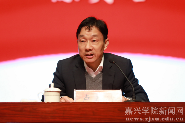 嘉兴市委常委、秘书长敖考权,省委办公厅协调处处长许立、副处长蒋海清,校领导、二级教学单位党政领导班子、党委委员、科级干部及学生党员和骨干代表到场聆听。