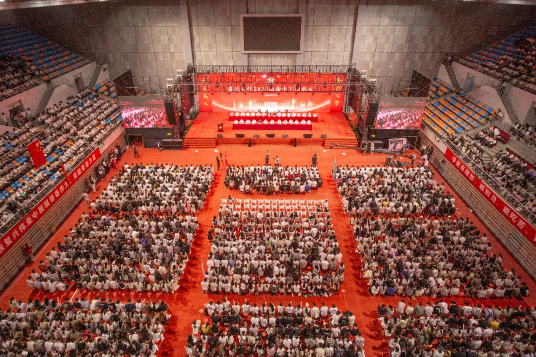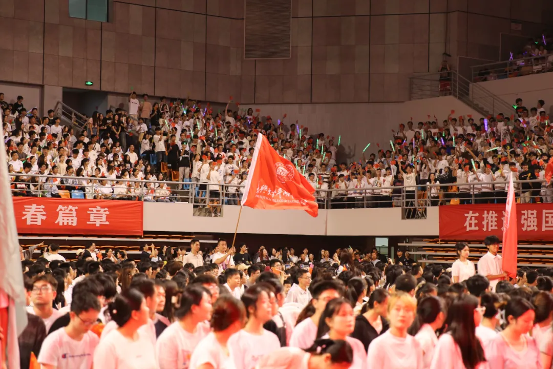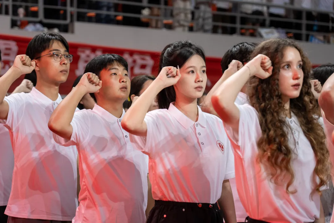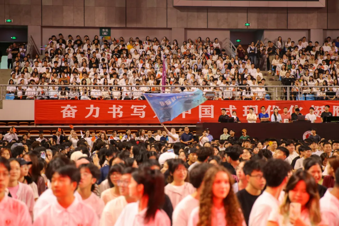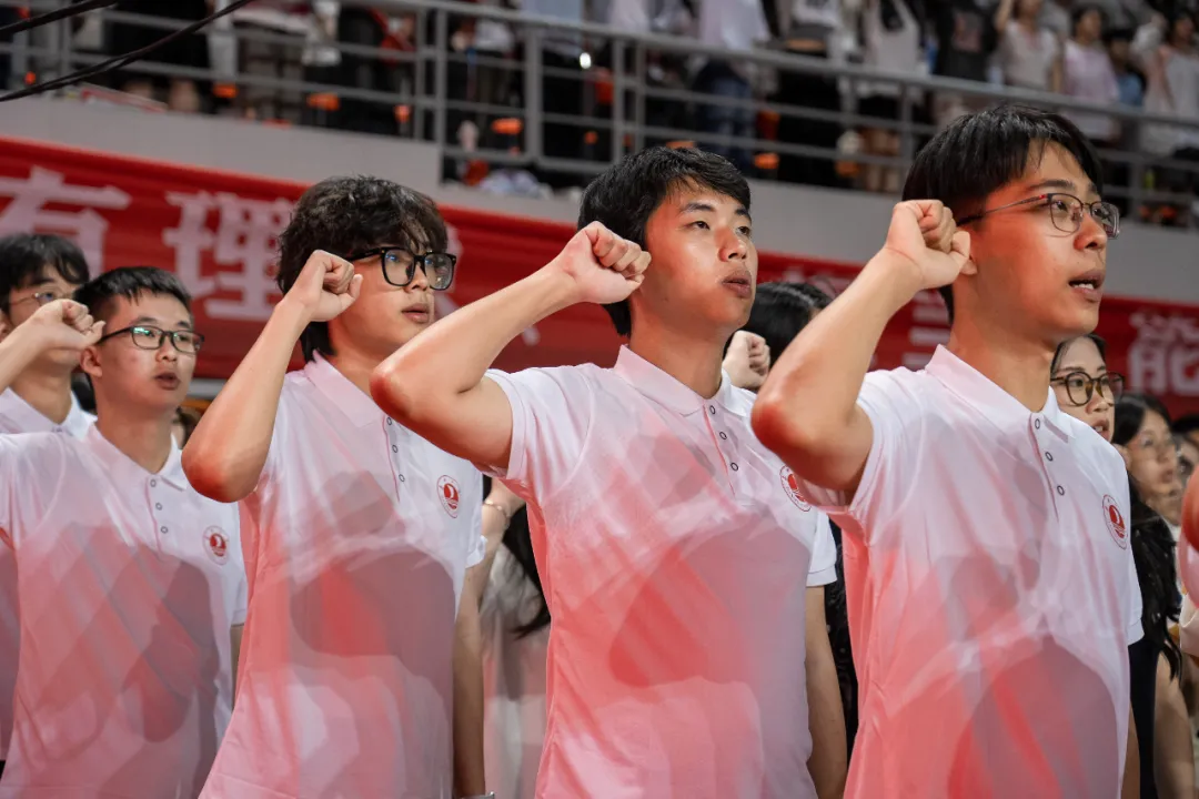 全体新生一起郑重宣誓:将努力茁壮成长为一名德智体美劳全面发展的,想得明白、说得明白、写得明白、干得明白的时代新人,为中国式现代化挺膺担当!请党放心,强国有我!新生的铮铮誓言响彻整个场馆。