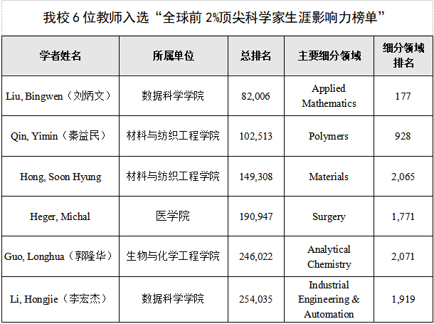 “全球前2%顶尖科学家生涯影响力榜单”中,数据科学学院刘炳文、李宏杰,材料与纺织工程学院秦益民、Hong Soon Hyung,医学院Heger Michal,生物与化学工程学院郭隆华6位教师入选。