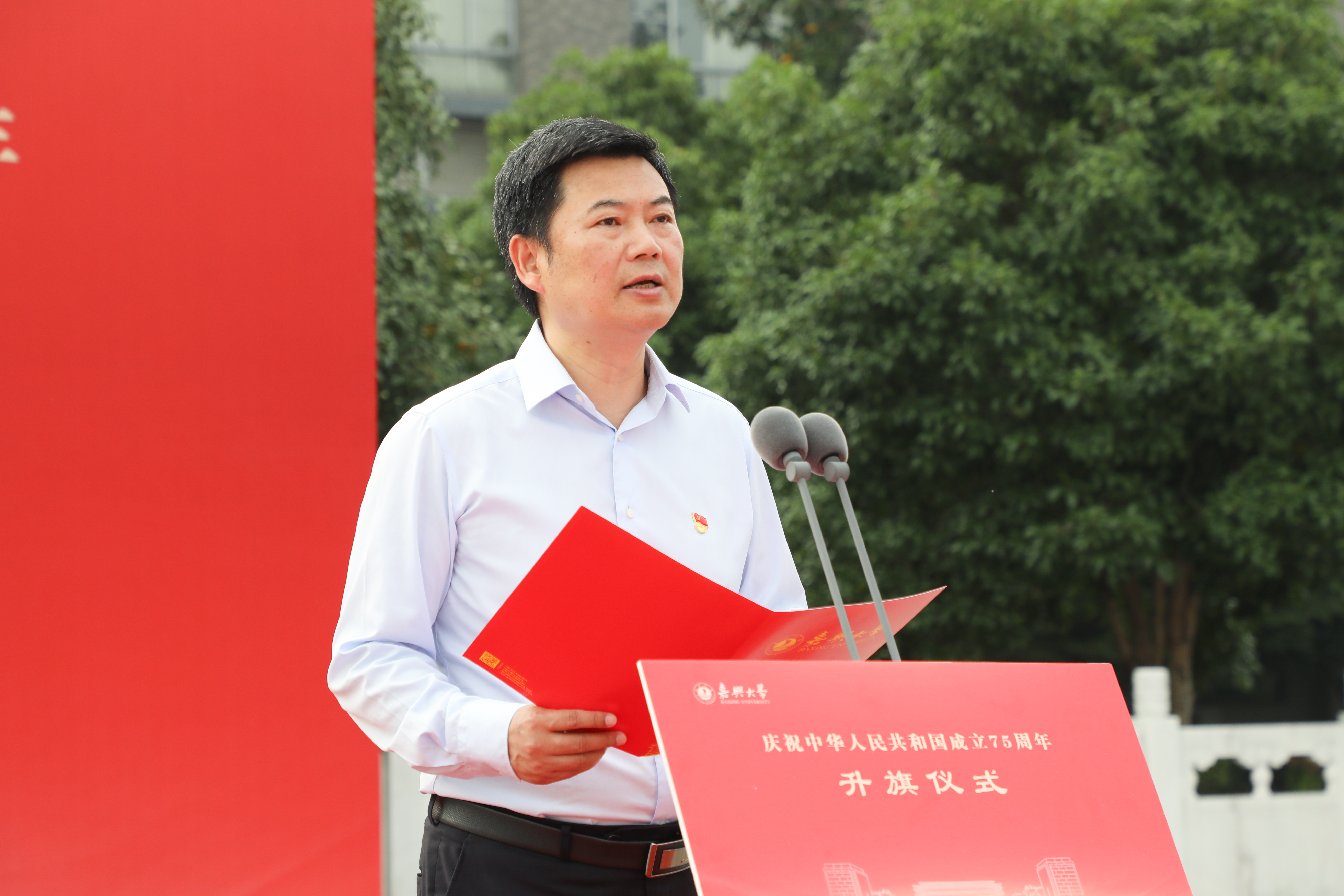 校党委书记沈希发表国旗下讲话。他表示,作为红船旁的高校,嘉兴大学将深入学习贯彻落实党的二十届三中全会精神和省委十五届五次全会精神,深刻领会习近平总书记关于教育的重要论述,坚决落实立德树人根本任务,加快“冲A、拼‘搏’、创一流”步伐,切实把进一步全面深化改革的战略部署转化为加快建设有特色、善创新的综合性高水平大学的强大力量。他希望广大教师大力弘扬教育家精神,坚定理想信念、陶冶道德情操、涵养扎实学识、勤修仁爱之心,全面落实立德树人根本任务,坚持“五育并举”,自信自强、踔厉奋发,争做学生为学、为事、为人的“大先生”,培养更多德智体美劳全面发展的社会主义建设者和接班人;希望同学们不负红船旁青年学子的凌云之志,秉持首创、奋斗、奉献的时代精神,高扬理想旗帜,珍惜时代机遇,奋进时代浪潮,勤勉学习、刻苦钻研,以青春之我、奋斗之我为强国建设、民族复兴伟业贡献青春力量!