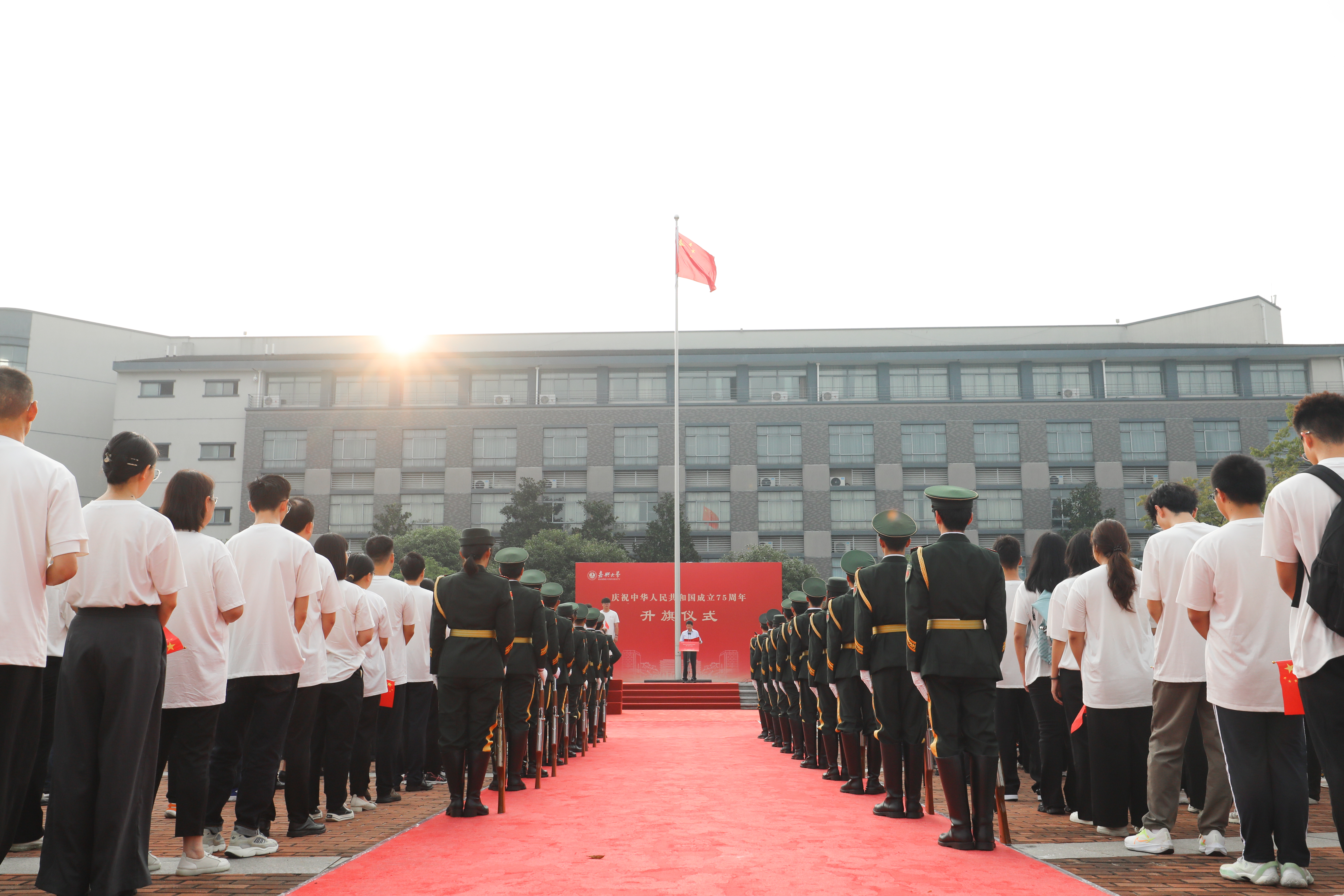 9月30日清晨,我校举行“强国复兴有我”主题升国旗仪式,庆祝中华人民共和国成立75周年。校领导沈希、钱方明、陈新友、王立玮、於建明、陈立力出席仪式。仪式由副校长(主持日常工作)张琦主持。