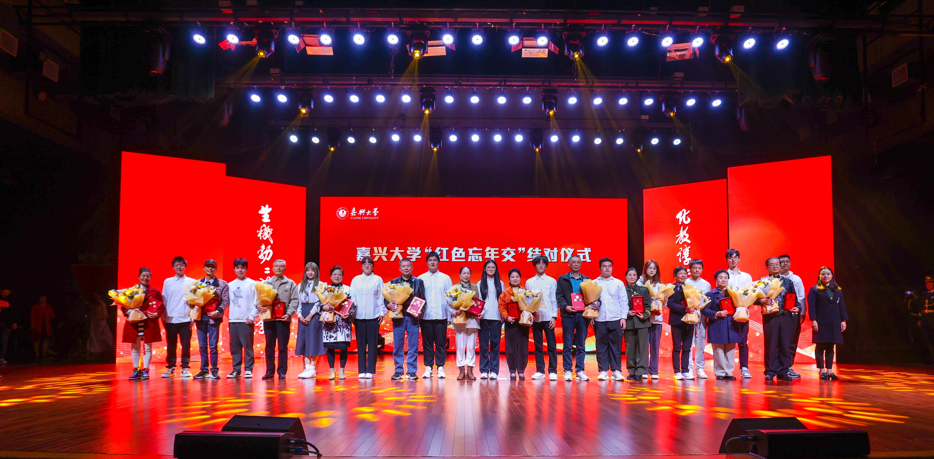 我校党委学生工作部、离退休工作处、各学院相关负责人,“红色忘年交”早期参与师生代表、嘉兴大学大学生“红军连”学生代表、生物与化学工程学院2023、2024级学生等参加纪念大会。
