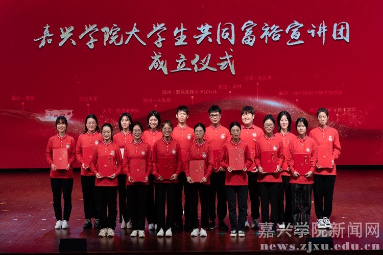 嘉兴学院大学生共同富裕宣讲团成立仪式上,钱方明为嘉兴学院大学生共同富裕宣讲团成员授旗;章豪锋为宣讲团指导教师颁发聘书。