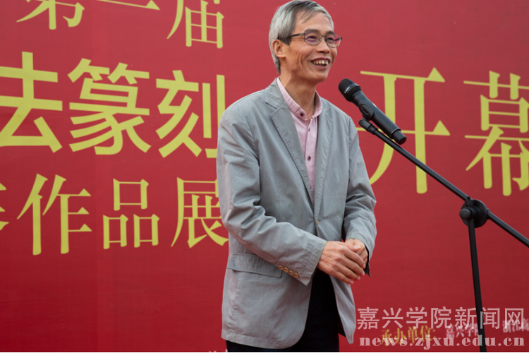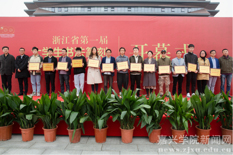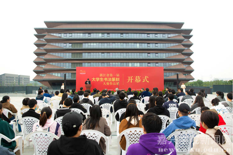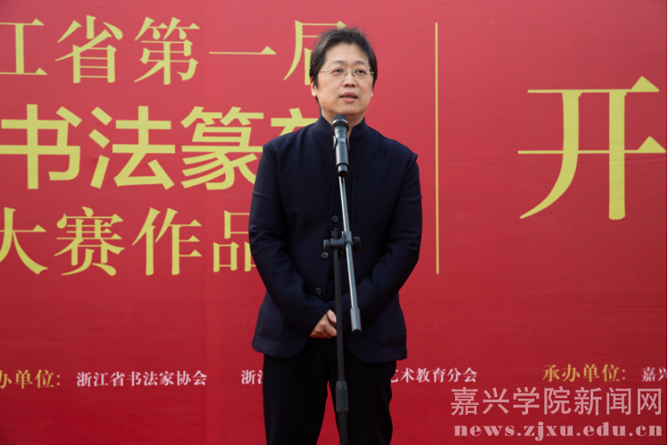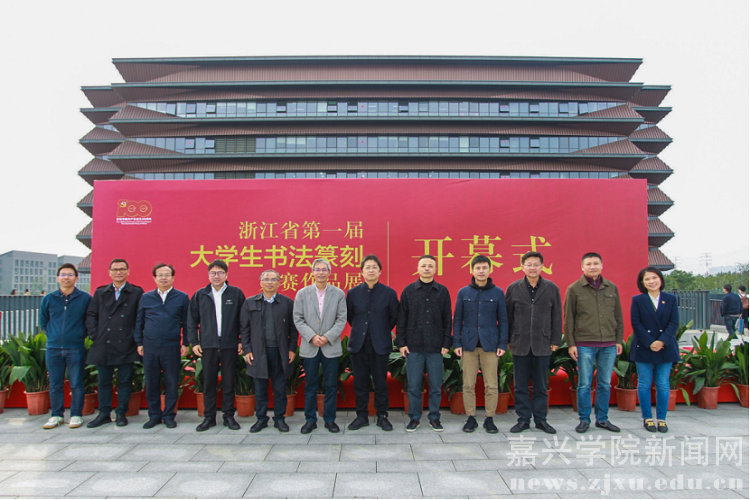10月21日下午,浙江省第一届大学生书法篆刻大赛作品展开幕式在我校图书馆二楼室外平台举行。浙江省文联副主席、省书法家协会主席赵雁君宣布展览开幕,浙江省书法家协会副主席、中国美术学院副院长沈浩讲话,我校党委副书记钱方明致开幕辞。浙江省书法家协会副主席、嘉兴市书法家协会主席沈岩松,浙江省书法家协会主席团成员、教育委员会主任、浙江财经大学党委副书记黄建新,浙江省书法家协会主席团成员、教育委员会秘书长黄寿耀,浙江省高教学会艺教委秘书长夏一鹏,浙江省书法家协会教育委员会副主任、浙江教育报社副社长薛平,浙江省书法家协会教育委员会副主任、浙江商业职业技术学院党委委员、组织部长徐同林等领导和嘉宾及优秀组织奖、获奖学生代表参加开幕式。