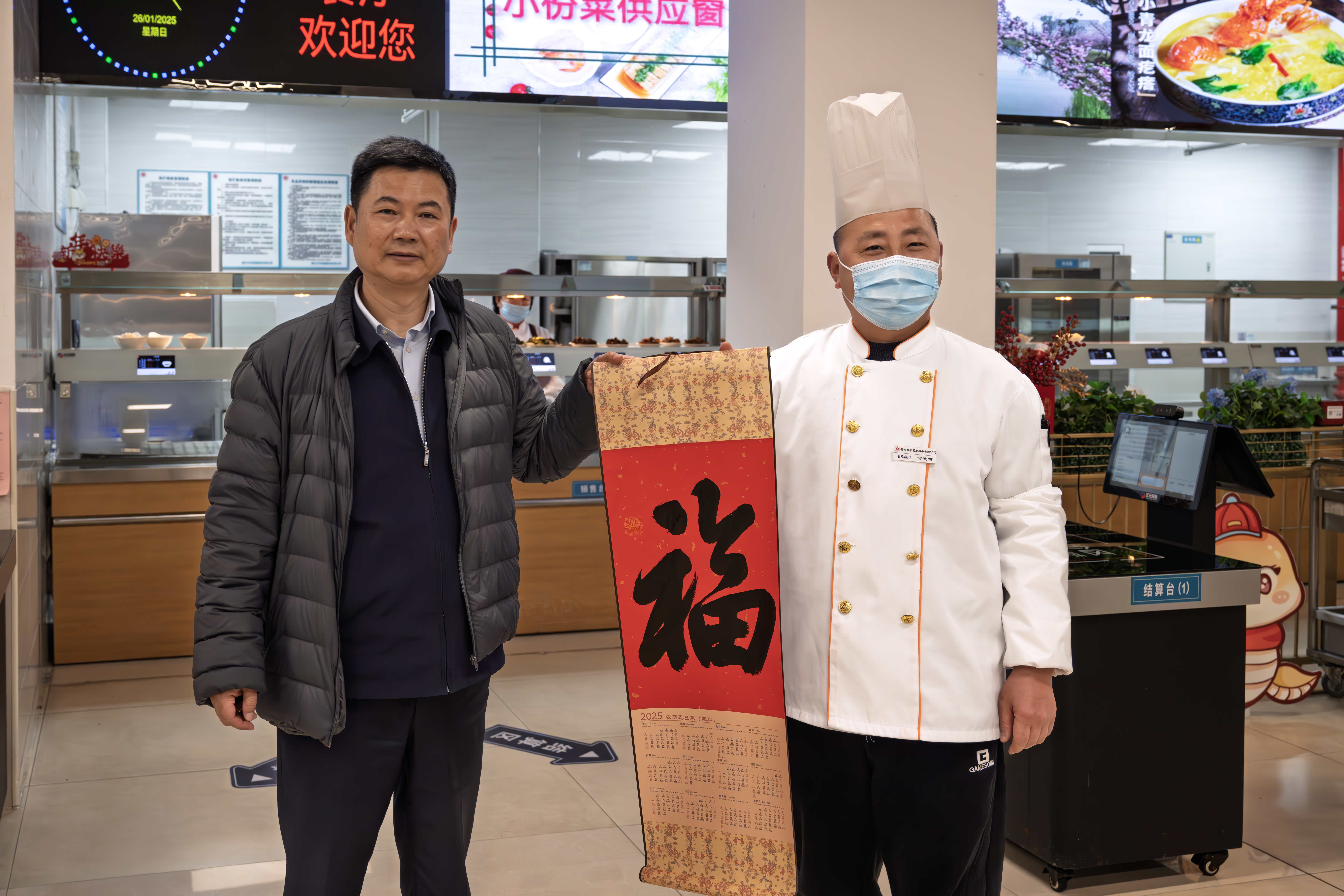 校领导慰问假期坚守一线工作人员代表,与学生宿舍管理人员、食堂工作人员、值班安保人员等亲切交谈,向大家致以节日问候,对大家在春节期间放弃休息、坚守岗位、保障学校正常运转所付出的辛勤努力表示由衷感谢,并表示学校将与大家共同守护校园,为全校师生营造一个安全、舒适的假期学习生活环境。