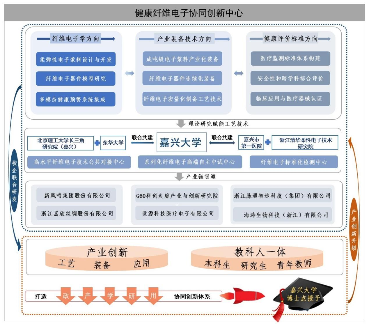 我校紧扣国家战略性新兴产业发展规划,精准聚焦现代纺织、柔性电子及健康医学的交叉领域,充分发挥材料与纺织工程学院的省重点实验室平台资源优势,积极联合多方力量,与浙江清华柔性电子技术研究院、东华大学、北京理工大学长三角研究院(嘉兴)、嘉兴市第一医院、新凤鸣集团股份有限公司、浙江嘉欣丝绸集团股份有限公司、嘉兴大学 G60 科创走廊产业与创新研究院、浙江脉通智造科技(集团)有限公司、世源科技医疗电子有限公司、海涛生物科技(浙江)有限公司等多家单位携手共建健康纤维电子协同创新中心。