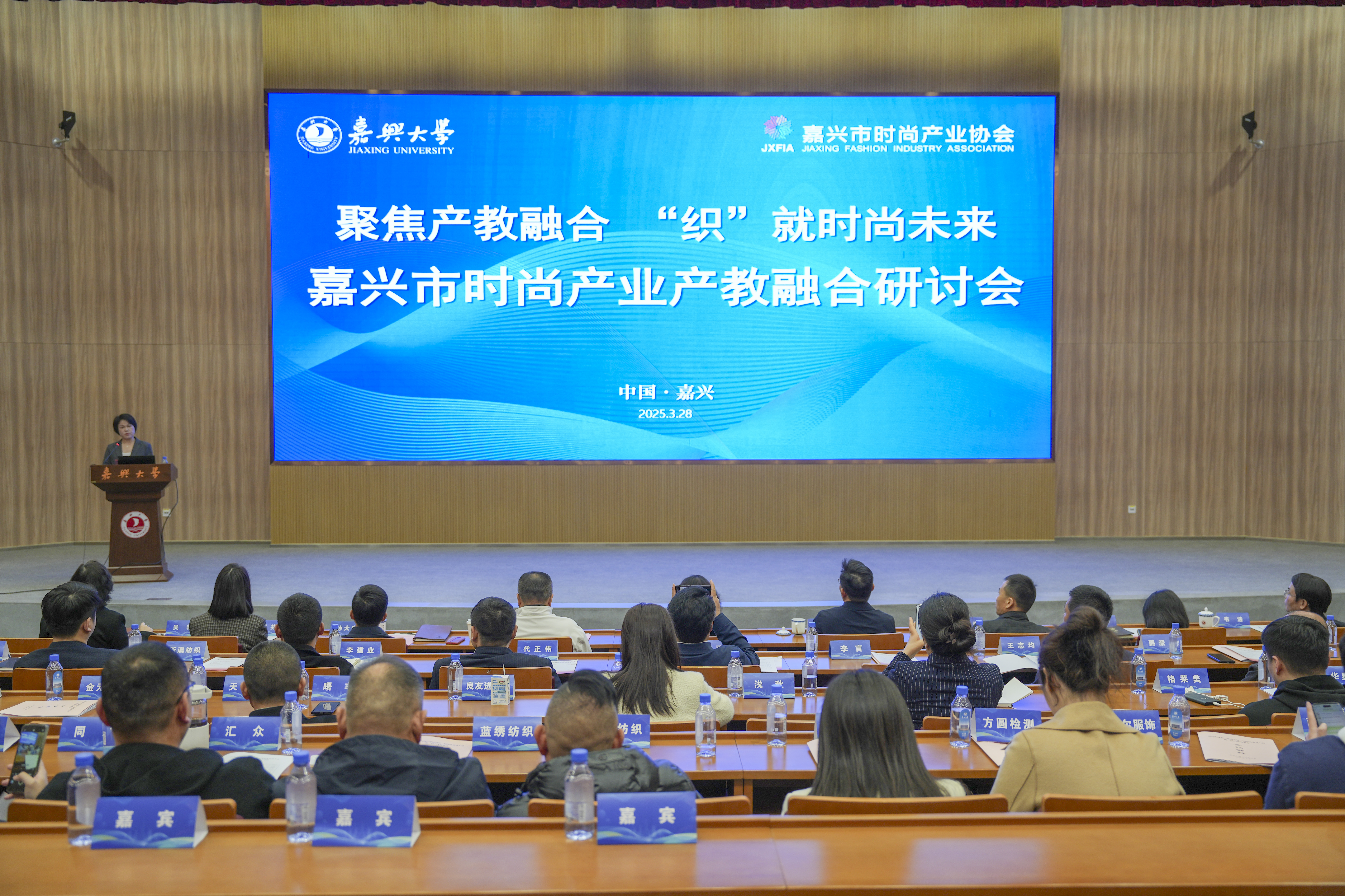 3月28日,由嘉兴市时尚产业协会与我校联合主办的嘉兴市时尚产业产教融合研讨会在我校举行。校会企签约共建的现代针织产业(人才)学院在研讨会上正式揭牌。
