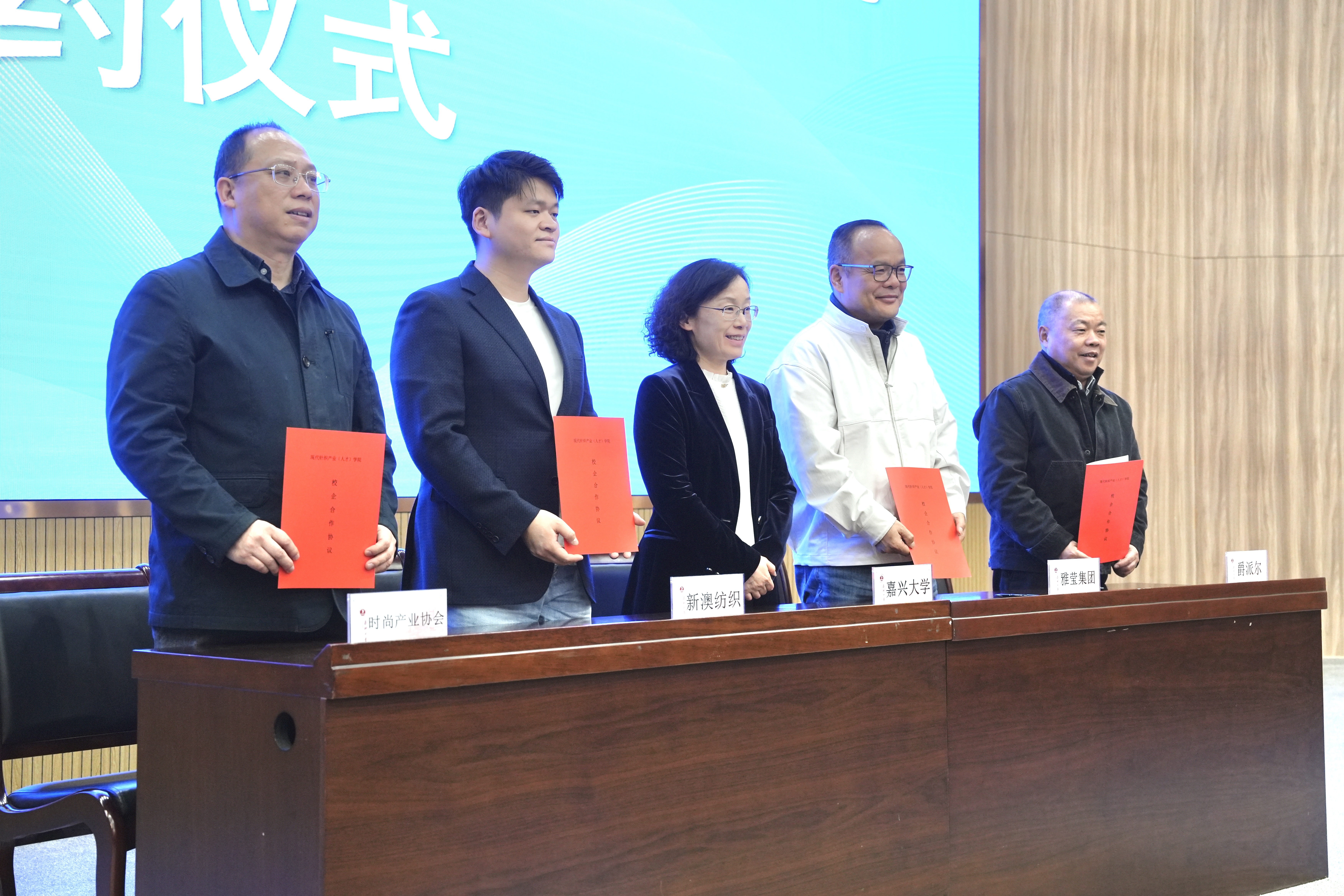 我校、嘉兴市时尚产业协会、雅莹集团股份有限公司、浙江新澳纺织股份有限公司、浙江爵派尔科技发展有限公司等校会企代表共同签署合作协议。