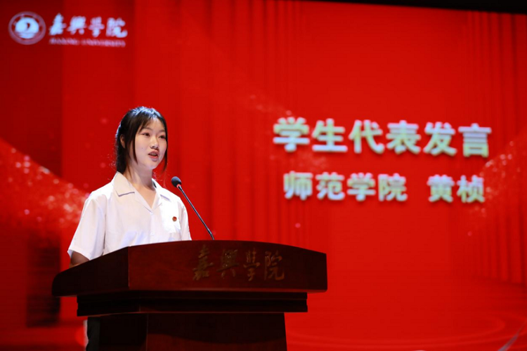 学生代表、平湖师范学院学前教育本科202班的黄桢发言。她表示,作为一名师范生、一位准教师,她为自己的专业选择感到无比骄傲自豪;同时,也明白肩上所背负的使命与责任。作为嘉院学子,她将传承嘉院之精神,不负冰鉴之初心,珍惜青春之韶光,盘固学业之根本,“方正为人,勤慎治学”,胸怀世界,情系家国,学与俱进,勇毅笃行。