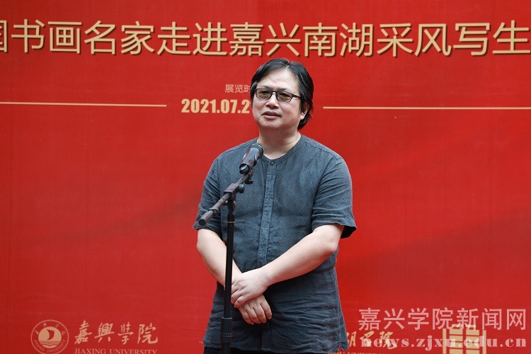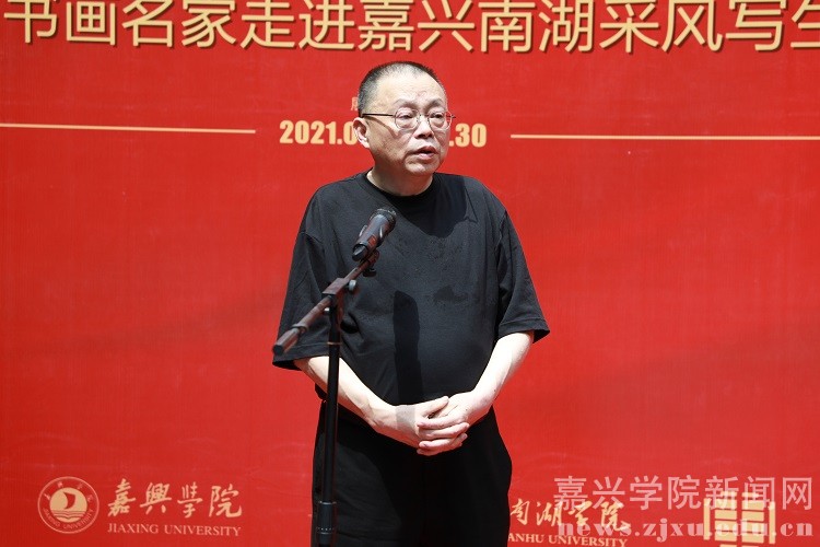 王平介绍了此次采风写生活动的基本情况,对给予活动支持的艺术家和嘉兴学院、嘉兴南湖学院师生表示感谢。他说,在建党100周年之际,中国美术报社策划“百年百幅·红色艺履”系列活动,组织赴嘉兴南湖采风写生,就是带领艺术家亲身感受嘉兴的人文底蕴,感受社会主义现代化建设所取得的成就,回顾建党百年的辉煌历程。他希望,未来嘉兴学院、嘉兴南湖学院与中国美术报社在名家进校园、美育教育等方面进一步加强合作,共谋发展。