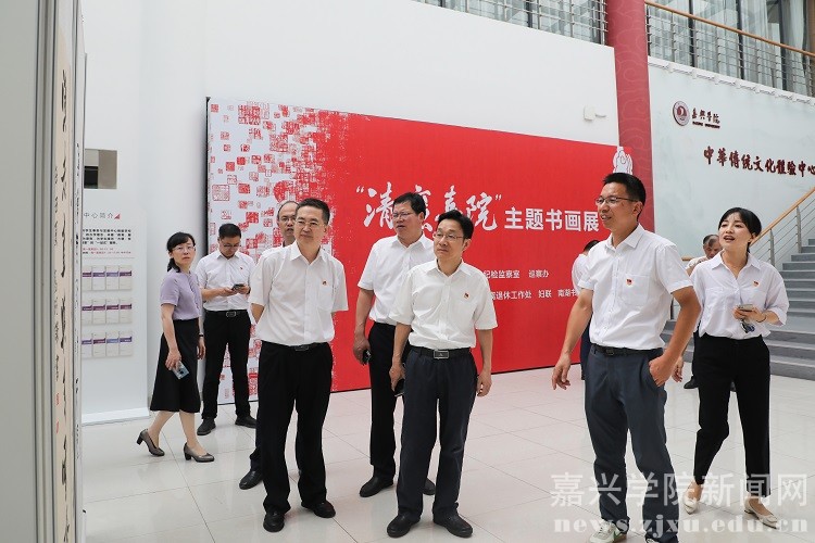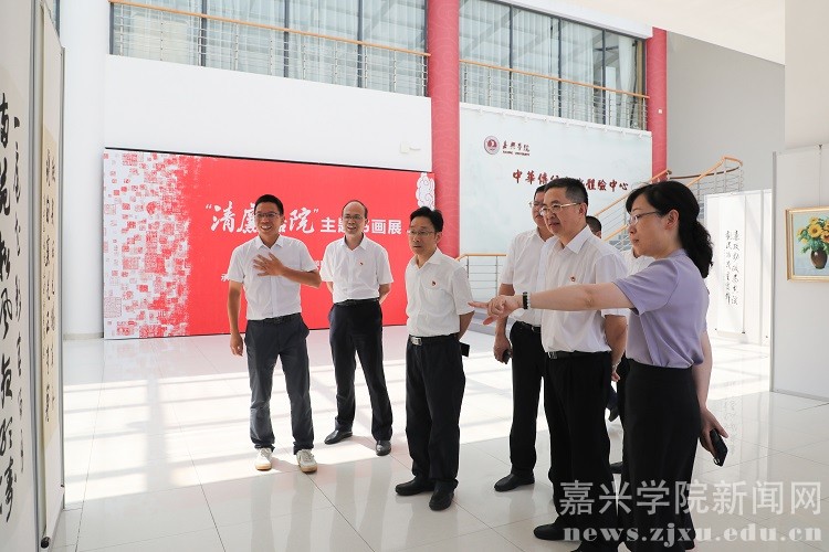 为庆祝中国共产党百年华诞,深入推进“清廉嘉院”建设,6月29日,由校纪委组织的“清廉嘉院”主题书画展在党群服务中心进行展出,在校领导班子成员于展出首日进行集体参观。