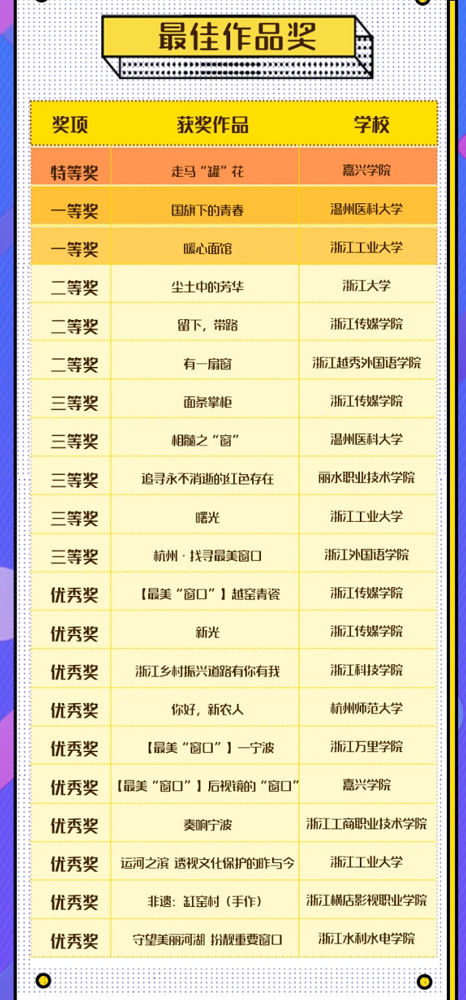 “你眼中的最美窗口”浙江省大学生短视频大赛旨在聚焦浙江建设“重要窗口”生动实践,通过参与创作主题性短视频作品,引导青年学子更好地为浙江改革发展贡献青春力量。据悉,本次大赛由中共浙江省委网信办、浙江省教育厅、共青团浙江省委、浙江广播电视集团、浙江省广播电影电视学会主办,浙江广播电视集团融媒体新闻中心承办,自去年12月启动以来,共收到来自70余所高校的1500多件作品,经评选,共21件作品获奖。