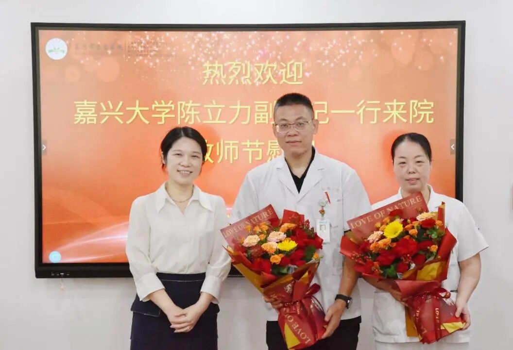 9月5日,嘉兴市政协主席陈利众,市人大常委会副主任、市总工会主席曹国良,副市长林万乐一行来校开展教师节走访慰问活动,看望奋战在立德树人一线的教育工作者,向大家致以节日的问候和诚挚的感谢。陈利众为优秀教职工代表送上鲜花和祝福,了解他们在日常教学中的所思所想,并实地参观了校史馆,听取学校历史沿革、办学特色等情况介绍。陈利众对学校近年来取得的办学成就给予充分肯定,他希望学校持续以更高标准做强特色学科,以更宽视野培养优秀人才,更好地服务和支撑嘉兴经济社会高质量发展。市教育局党组书记、局长武曜云随同慰问。我校党委书记沈希、党委副书记陈立力和优秀教职工代表康文龙、张先超、周二军、颜志勇、白春苏、王晓光等参加活动。