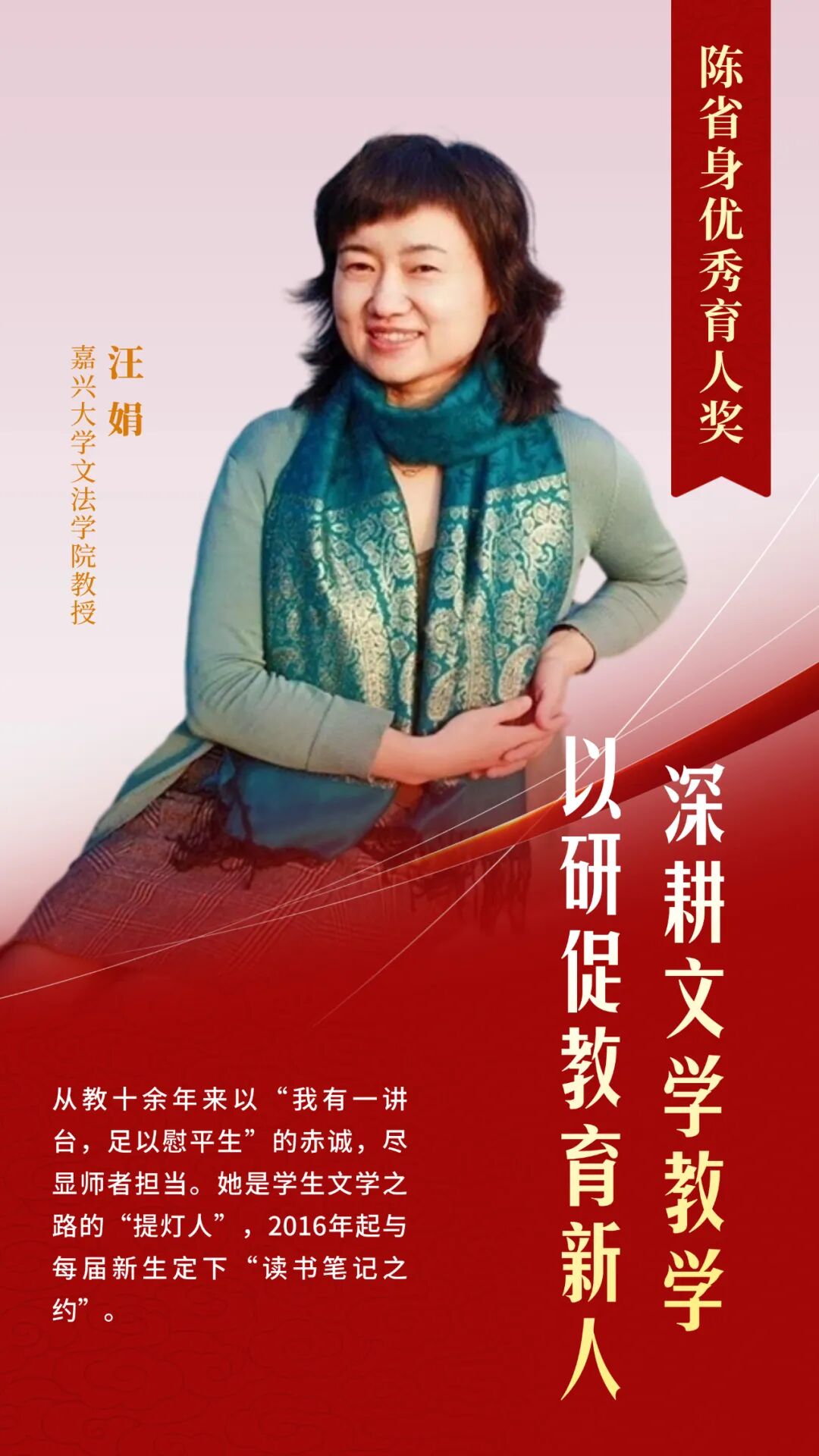 汪娟,女,嘉兴大学文法学院教授,2014年到校任教,十余年来以“我有一讲台,足以慰平生”的赤诚,尽显师者担当。