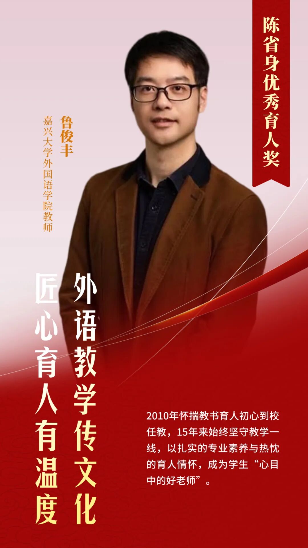鲁俊丰,男,嘉兴大学外国语学院教师。2010年怀揣教书育人初心到校任教,15年来始终坚守教学一线,以扎实的专业素养与热忱的育人情怀,成为学生“心目中的好老师”。