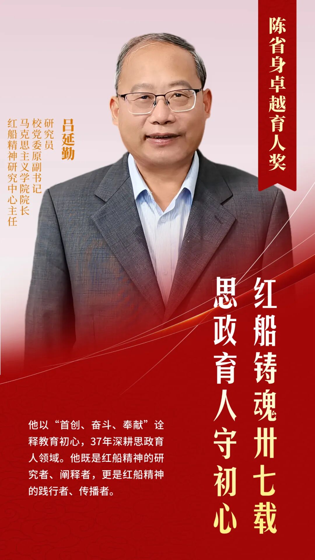吕延勤,男,研究员,校党委原副书记、马克思主义学院院长、红船精神研究中心主任,2020年入选享受国务院政府特殊津贴专家。他以“首创、奋斗、奉献”诠释教育初心,37年深耕思政育人领域。