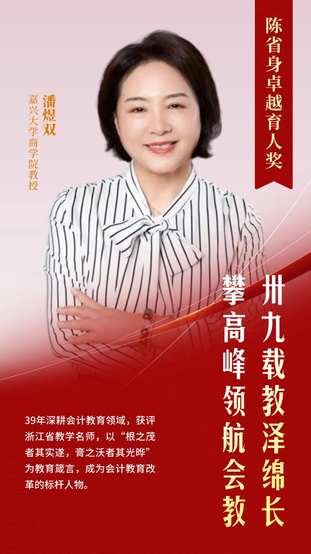 潘煜双,女,二级教授,嘉兴大学商学院教师,1986年留校任教,39年深耕会计教育领域,获评浙江省教学名师,以“根之茂者其实遂,膏之沃者其光晔”为教育箴言,成为会计教育改革的标杆人物。