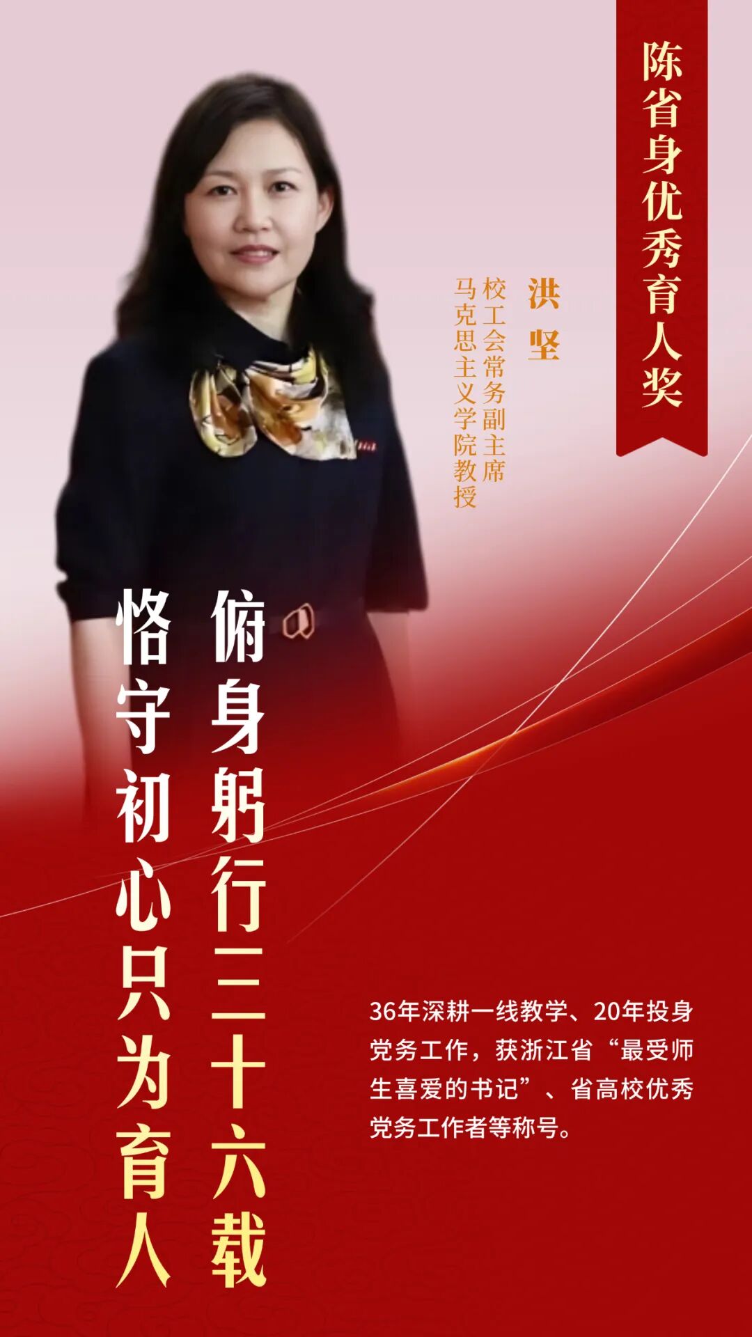 洪坚,女,教授,硕士生导师,校工会常务副主席、马克思主义学院教师,36年深耕一线教学、20年投身党务工作,获浙江省“最受师生喜爱的书记”、省高校优秀党务工作者等称号。