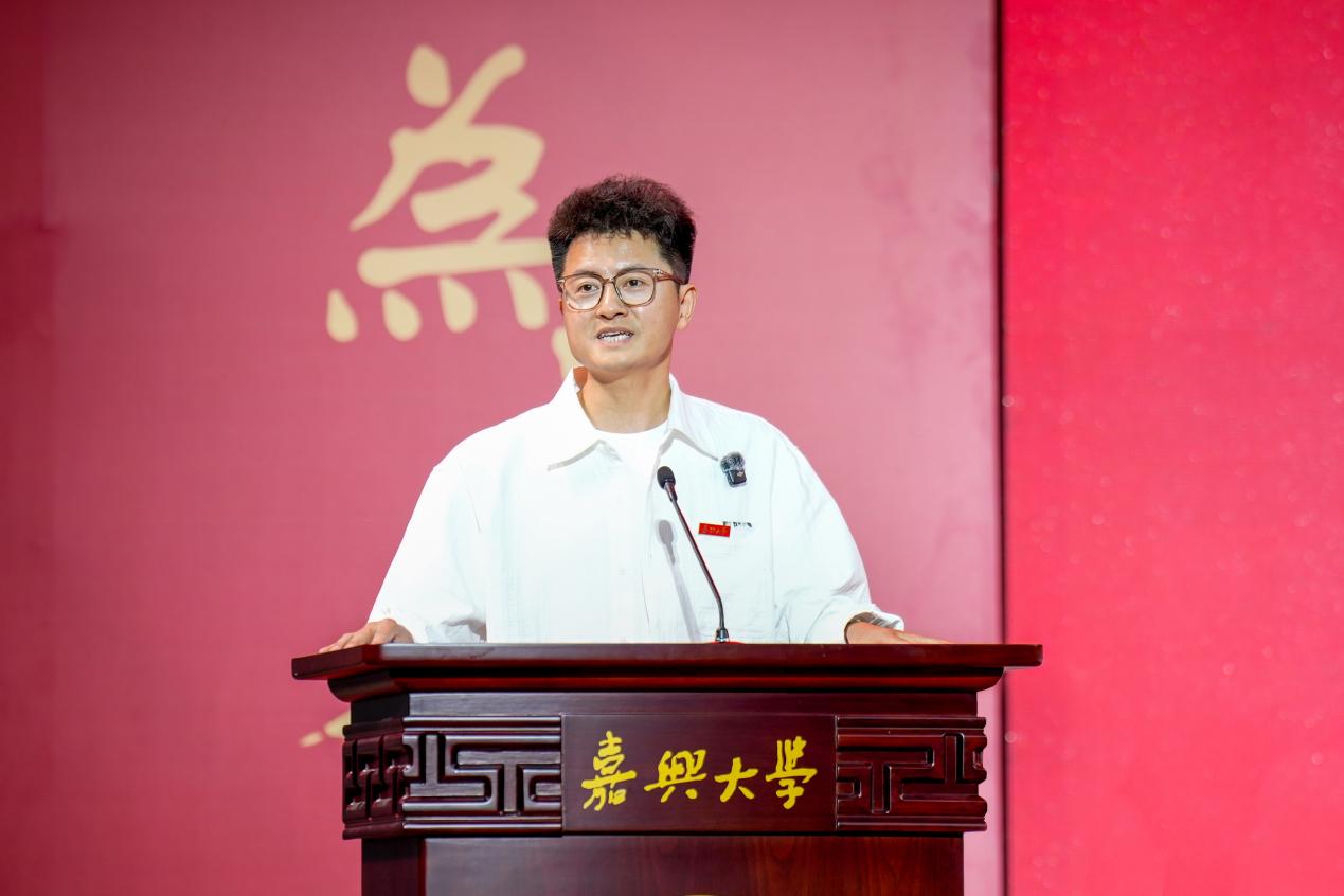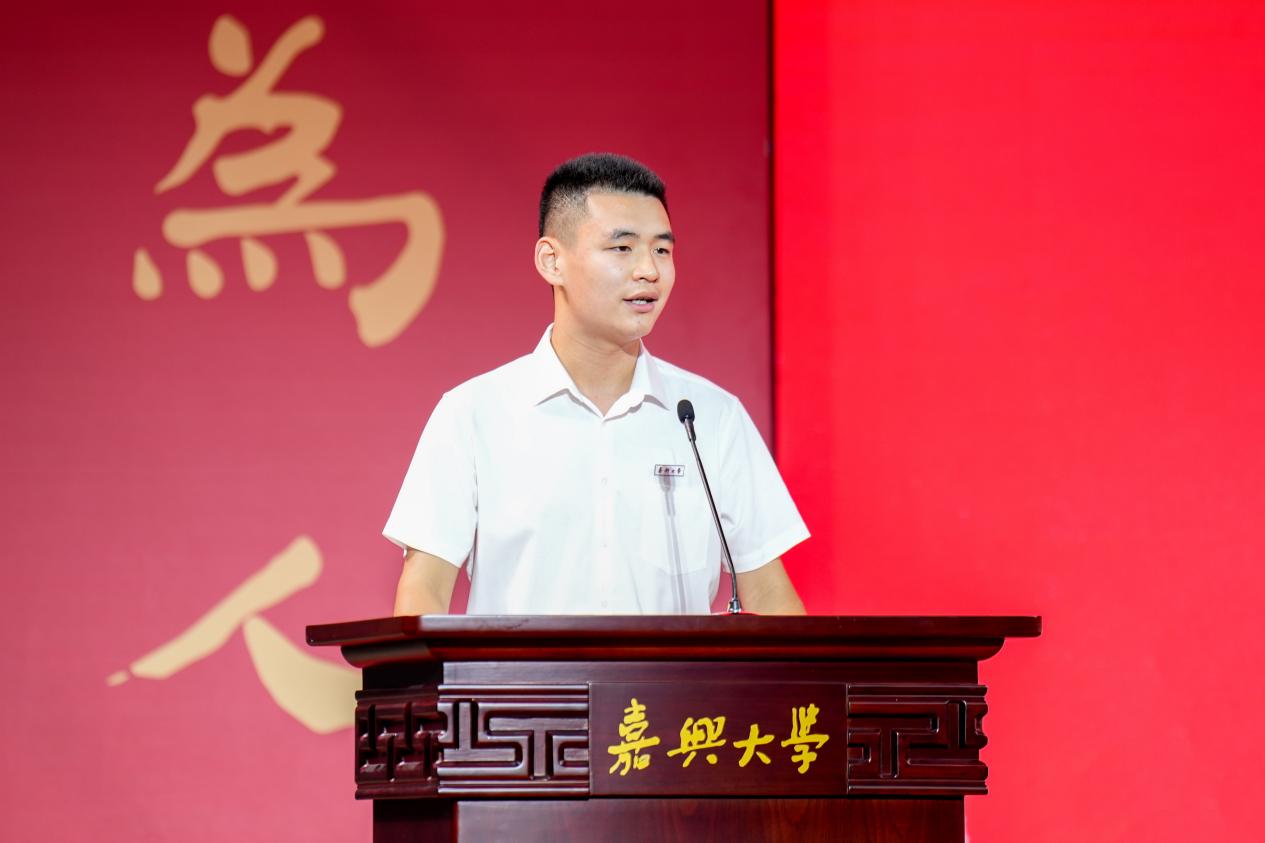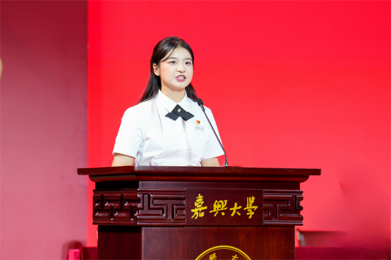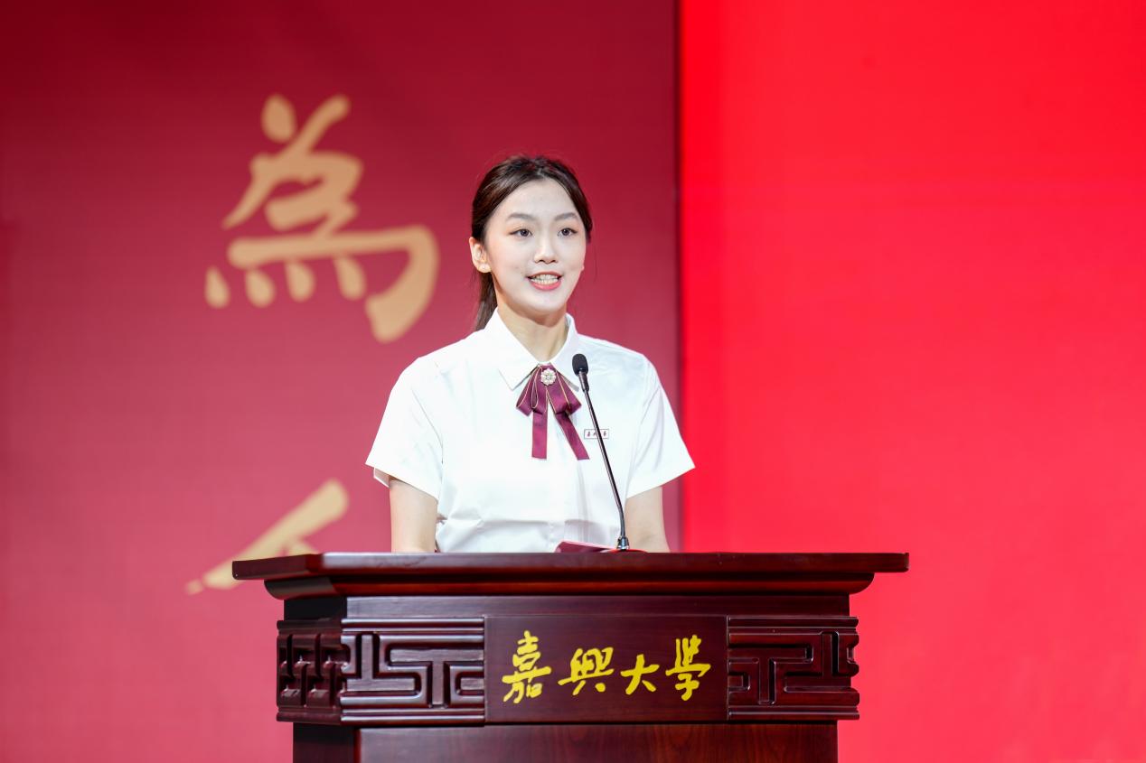在校生代表、医学院临床医学专业吴雨桐同学以学姐的身份分享了自己在嘉大的成长经历,并与新生共勉:把红船精神装进心里,把专业本领练在手上,把青春书写在民族复兴的伟业中,成为既能经受风雨、也能照亮他人的嘉大人。
