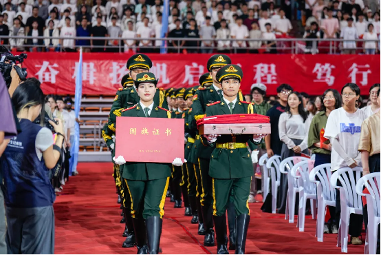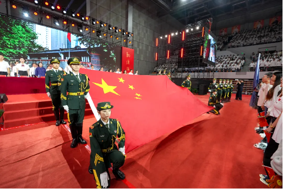 旗帜引领方向,信仰照亮前程。在开学典礼现场,一面曾于2024年1月18日嘉兴大学揭牌当天,在天安门广场升起的五星红旗,在“大学生红军连”的护卫下,庄严入场。全体师生肃立行注目礼,齐唱国歌,向国旗致敬。这面鲜艳的国旗,见证了全体新生的人生新起点,也必将激励每一位嘉大学子以青春之我,投身强国建设、民族复兴的伟大征程。