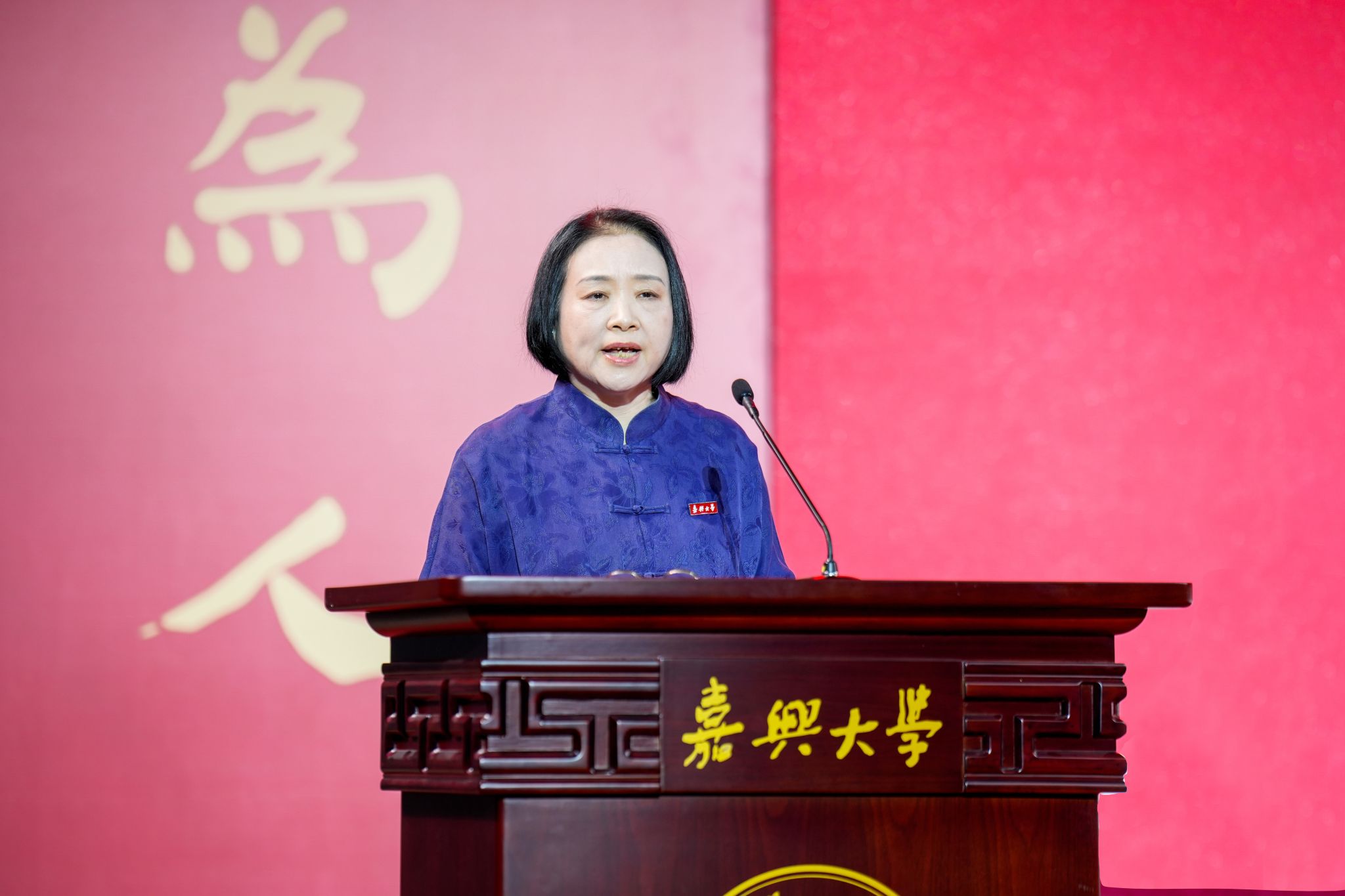 教师代表、浙江省教学名师、嘉兴大学陈省身卓越育人奖获得者、商学院潘煜双教授深情讲述了她在嘉大求学、从教42年的经历与感悟,并寄语新生,在未来的大学生涯中,要为人以德、为事以恒、为业以勤,把书读厚、把视野拓宽、把情谊存暖,实现个人成长与学校发展的双向奔赴。