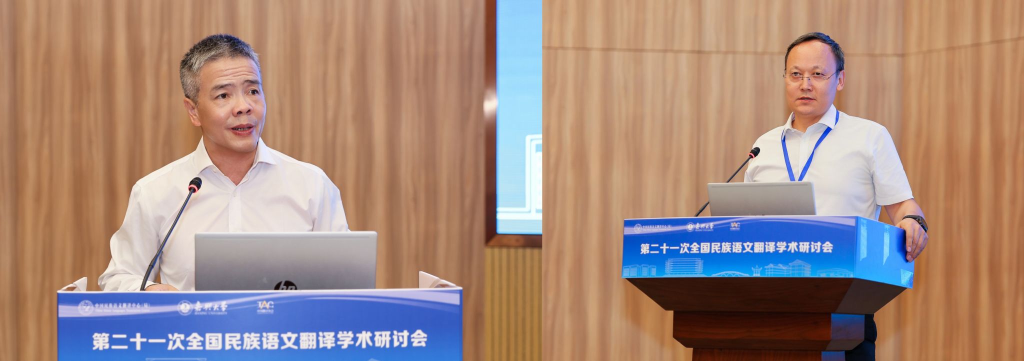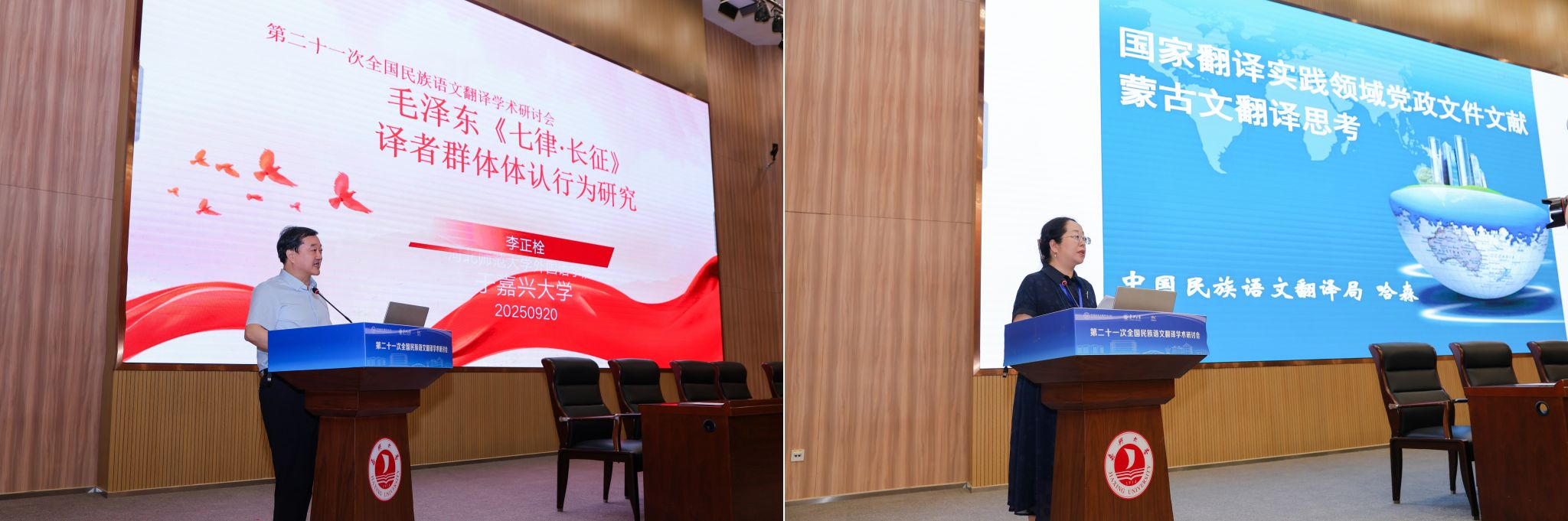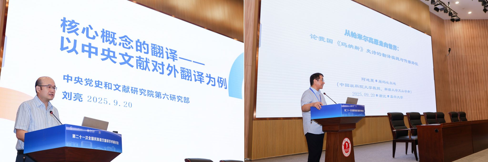 在交流研讨环节,5个分会场的近80位专家学者分别围绕“马克思主义中国化时代化成果在民族地区的翻译与传播——党政文献、法律法规及新词术语翻译研究”“中华民族共同体视域下的民族语文翻译研究”“民族语文翻译与中国特色翻译理论体系构建研究、翻译技术研究”“国家翻译能力建设中的民族语文翻译研究”“中华典籍翻译传播研究”等议题宣读论文并展开交流讨论。其中,嘉兴大学外国语学院喻锋平教授、嘉兴大学浙江省中国共产党创建史研究中心执行主任康文龙教授分别作题为《文化诗学视域下的畲族长联歌英译浅论》《民族地区马克思主义传播文献概述》的主题发言。研讨会多样的视角、丰富的内容、交叉跨界的互动,展示了民族语文翻译在研究力量、研究成果广度和深度上质的提升,进一步推动翻译界助力构建铸牢中华民族共同体意识理论和中国本土翻译理论的学科体系、学术体系、话语体系建设。