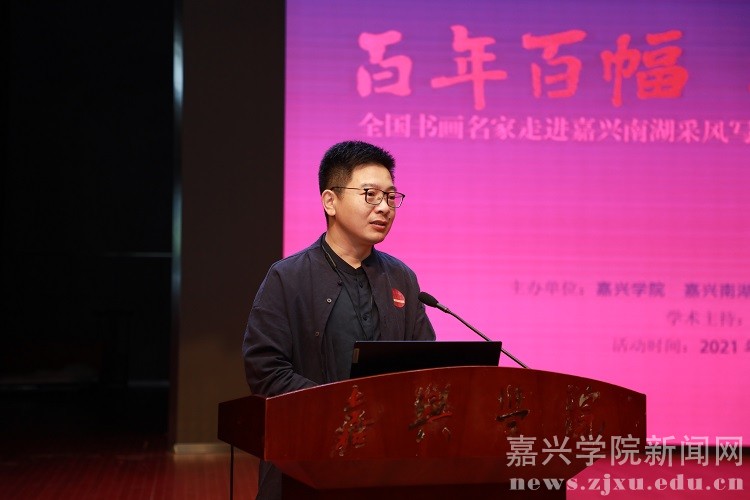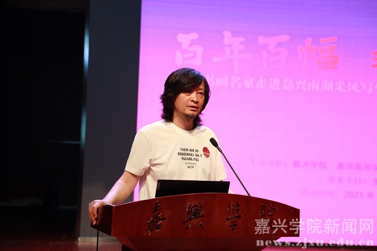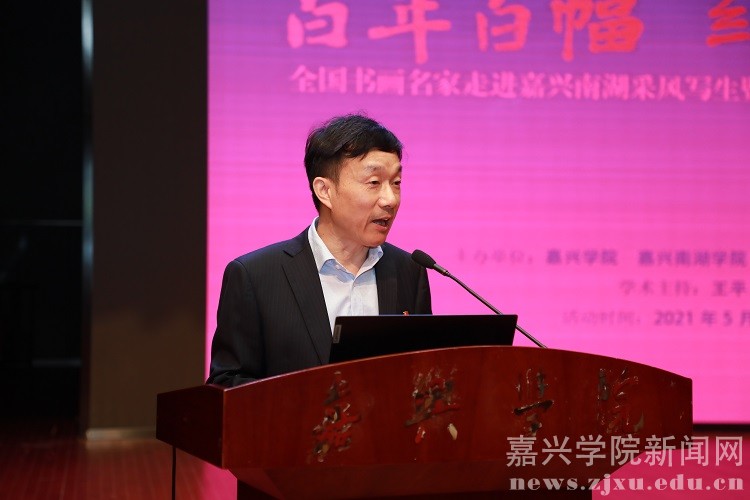 王平在致辞中对我校、嘉兴南湖学院所做出的大力支持表示感谢。他指出,“红色艺履”是为庆祝中国共产党成立100周年而策划的系列活动,是《中国美术报》作为国家级美术专业媒体落实习近平总书记在文艺工作座谈会上重要讲话精神,践行新时代美育使命的重要载体,也是艺术家们获得红色感悟,贡献艺术力量的重要契机。此次活动能够走进嘉兴、走近南湖红船,追根溯源意义重大,同时又能够走进高校、走近青年学子,对促进高校美育工作发展发挥积极作用。
