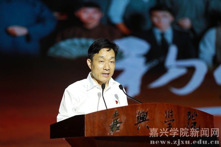 卢新波代表学校向各位嘉宾、老师、同学的到来表示欢迎,并介绍了嘉兴学院及话剧《初心》的基本情况。他指出,作为中国革命红船起航地高校,嘉兴学院自觉承担起弘扬红船精神、传承红色基因的政治担当,红色话剧《初心》的展演就是生动体现。他表示,当前学校正在举行话剧《初心》“百年百场”演出活动,以100场公益巡演向中国共产党百年华诞献礼,希望广大师生通过观看话剧《初心》,重回那段惊心动魄的历史、激情燃烧的岁月,追寻100年前在风雨如磐中担起救亡图存重任的热血青年的足迹;感悟共产党人开天辟地、敢为人先的首创精神,坚定理想、百折不挠的奋斗精神,立党为公、忠诚为民的奉献精神。他要求,作为中国革命红船起航地的青年学子,要充分运用好“红色根脉”的资源,自觉传承红色基因、赓续红色血脉,当好红船精神的忠实守护者、传承者和践行者,坚定信念、志存高远,脚踏实地、不懈奋斗,为实现中华民族伟大复兴的中国梦贡献青春力量!