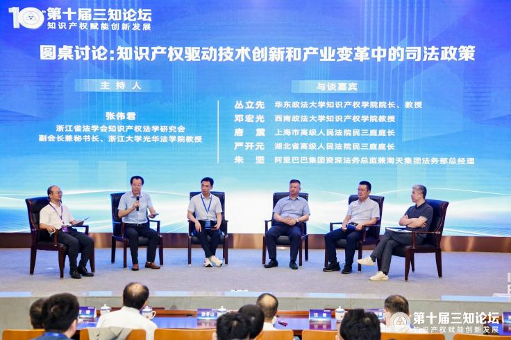 圆桌会议环节,华东政法大学知识产权学院院长丛立先教授、西南政法大学知识产权学院教授邓宏光、上海市高级人民法院民三庭庭长唐震、湖北省高级人民法院民三庭庭长严开元、阿里巴巴集团资深法务总监兼淘天集团法务部总经理朱坚就“知识产权驱动技术创新和产业变革中的司法政策”展开讨论。讨论由浙江省法学会知识产权法学研究会副会长兼秘书长、浙江大学光华法学院教授张君伟主持。