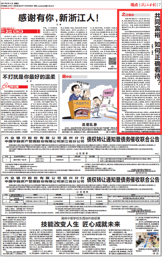5月12日,《浙江日报》刊发我校党委书记卢新波和经济学院院长文雁兵的署名文章 《共同富裕,如何正确看待?》