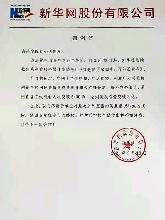 近日,我校初心话剧社收到来自新华社的感谢信。信中表示,为庆祝中国共产党百年华诞,自3月23日起,新华社陆续推出系列重磅全媒体直播节目《红色追寻第四季:百年正青春》。节目推出后,在网上持续热播、广泛传播,引发广大网民特别是年轻网民共情共鸣共振并积极点赞分享。据不完全统计,系列直播在线观看人次突破5400万,总浏览观看量突破3亿。