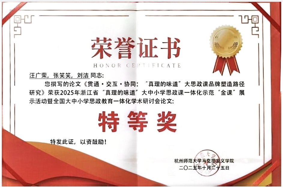 10月25日,浙江省“真理的味道”大中小学思政课一体化示范“金课”展示活动暨全国大中小学思政教育一体化学术研讨会在杭州举行,评选出“金课”特等奖4项、研讨会论文特等奖3项,我校课程、论文双双获得特等奖。其中大中小学思政课一体化课程“红心向党 红船育人”荣获浙江省“真理的味道”大中小学思政课一体化示范“金课”特等奖,论文《贯通·交互·协同:“真理的味道”大思政课品牌塑造路径研究》荣获全国大中小学思政教育一体化学术研讨会论文特等奖。